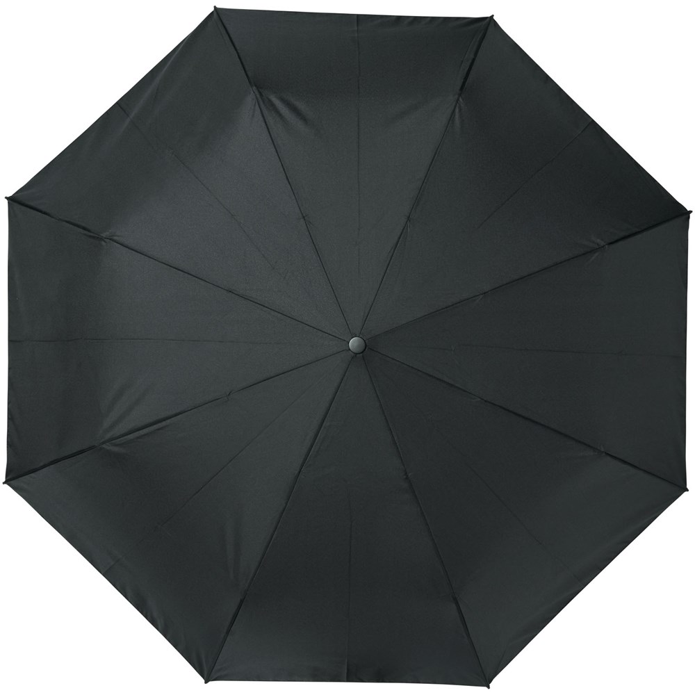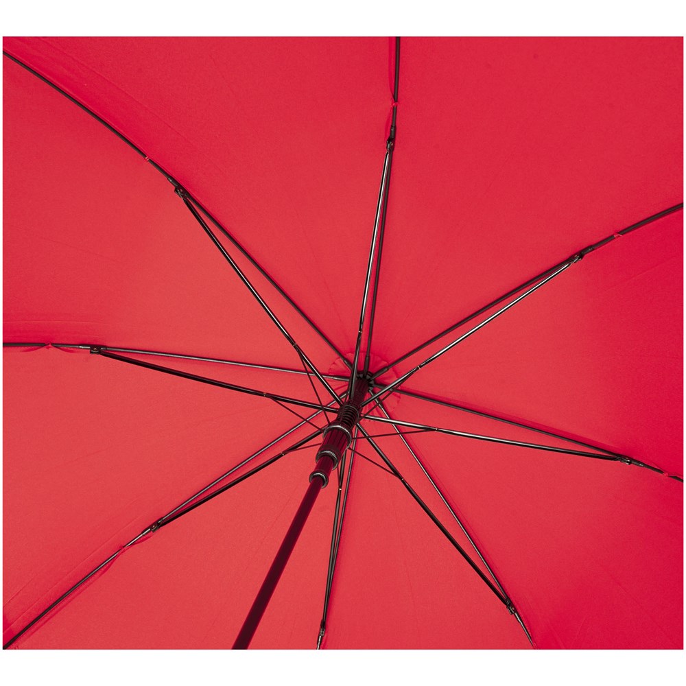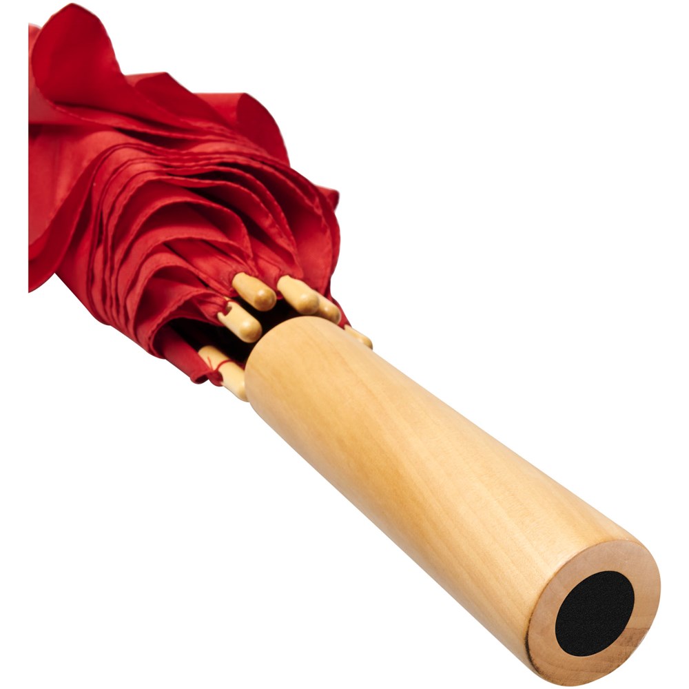 Automatisch openende paraplu met een gerecycled PET pongé polyester scherm. De stevige metalen schacht en het hoogwaardige frame met glasvezel ribben bieden flexibiliteit bij winderige omstandigheden. In combinatie met het houten handvat, de punten en het gerecyclede PET pongé polyester scherm biedt het model een duurzame keuze. Verkrijgbaar in de meest diverse moderne kleuren met een groot decoratievlak op elk van de panelen en ook de houten handgreep kan worden gedecoreerd.
