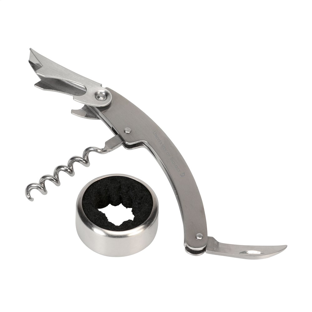 2-delige wijngeschenkset: matstalen kelnermes en druppelvanger. Per set in doos.