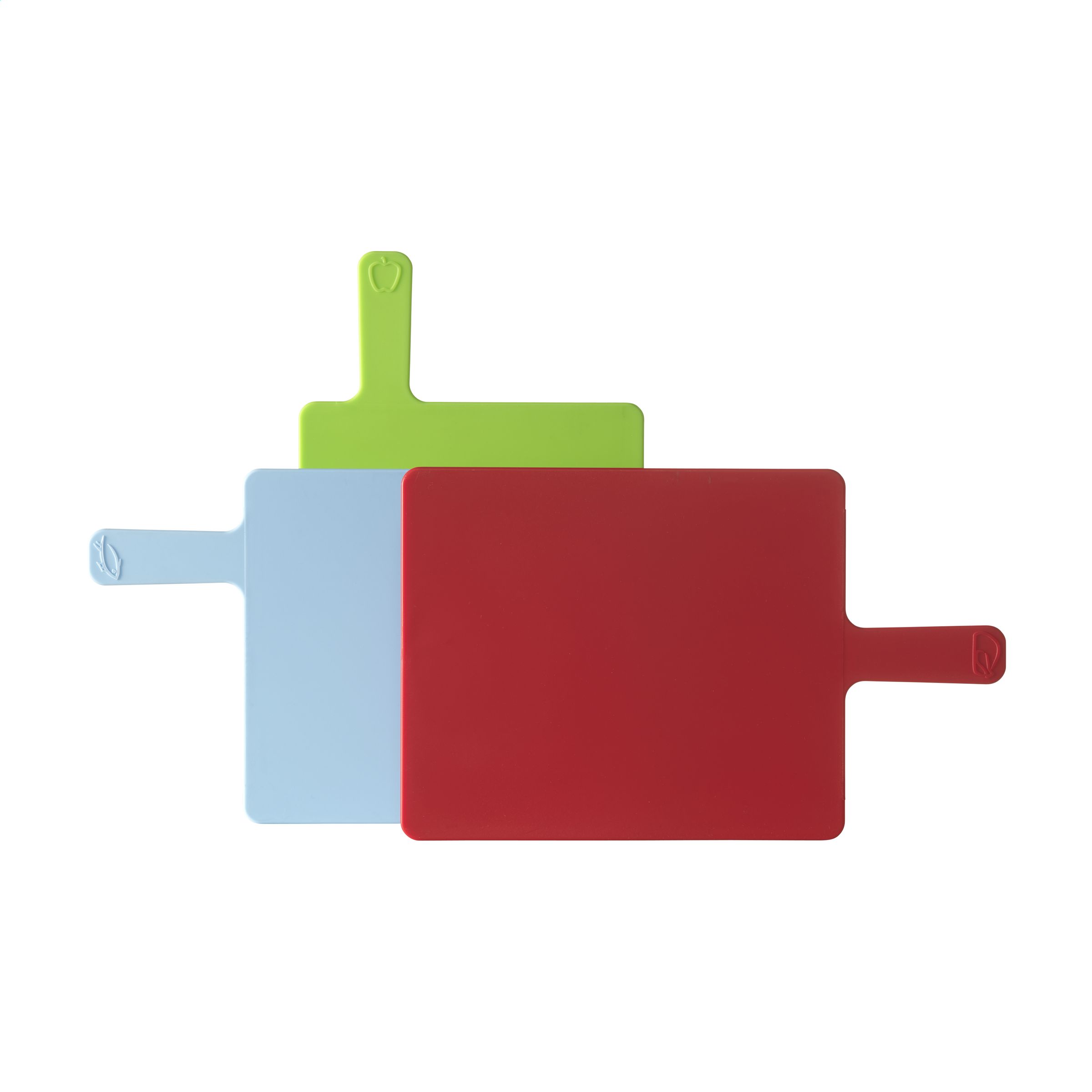 Compacte, kleurrijke set van 3 egale, kunststof snijplanken in een zilverkleurige houder. Het gebruik van aparte snijplanken voor groenten en fruit (groen), vlees (rood) en vis (blauw) voorkomt kruisbesmetting van bacteriën. Praktisch en hygiënisch.