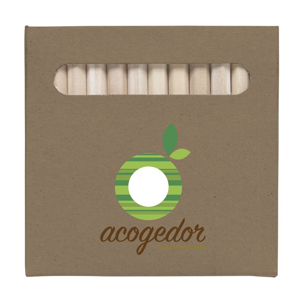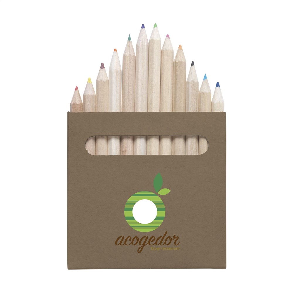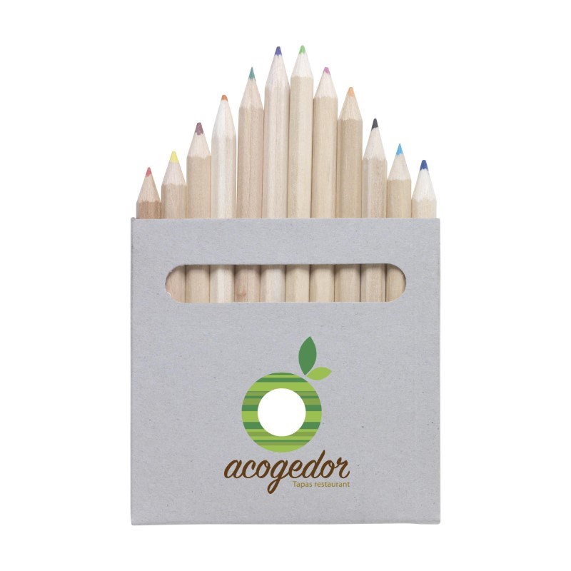 12 houten, ongelakte, geslepen kleurpotloden in een doosje van kringloopkarton.