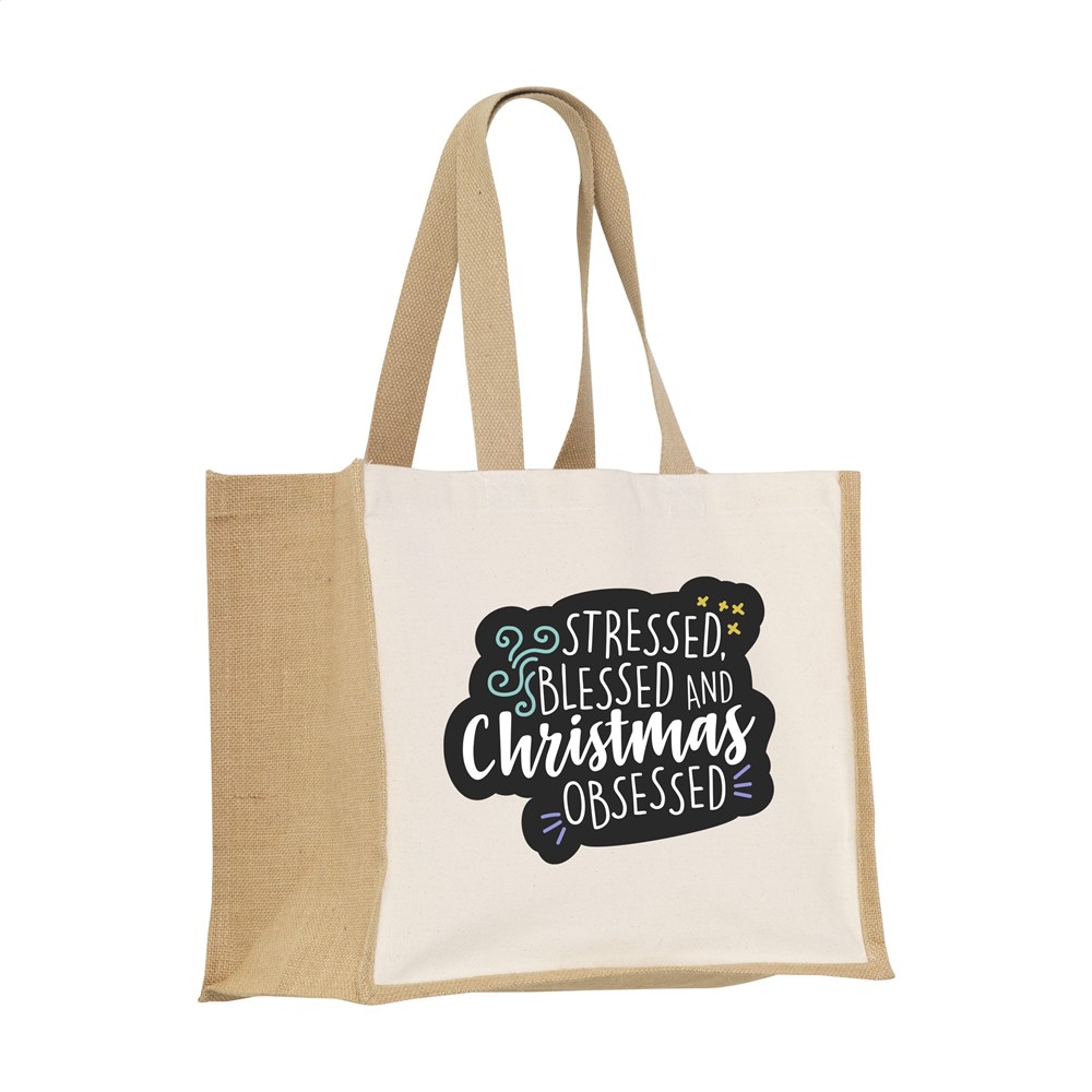 Extreem sterke winkeltas voor een milieuvriendelijke promotie. Met veel ruimte voor je boodschappen. Met op elkaar afgestemde natuurlijke kleuren en een materiaalcombinatie van jute en canvas (320 g/m²). Lange hengsels. Ideaal voor veelvuldig hergebruik.