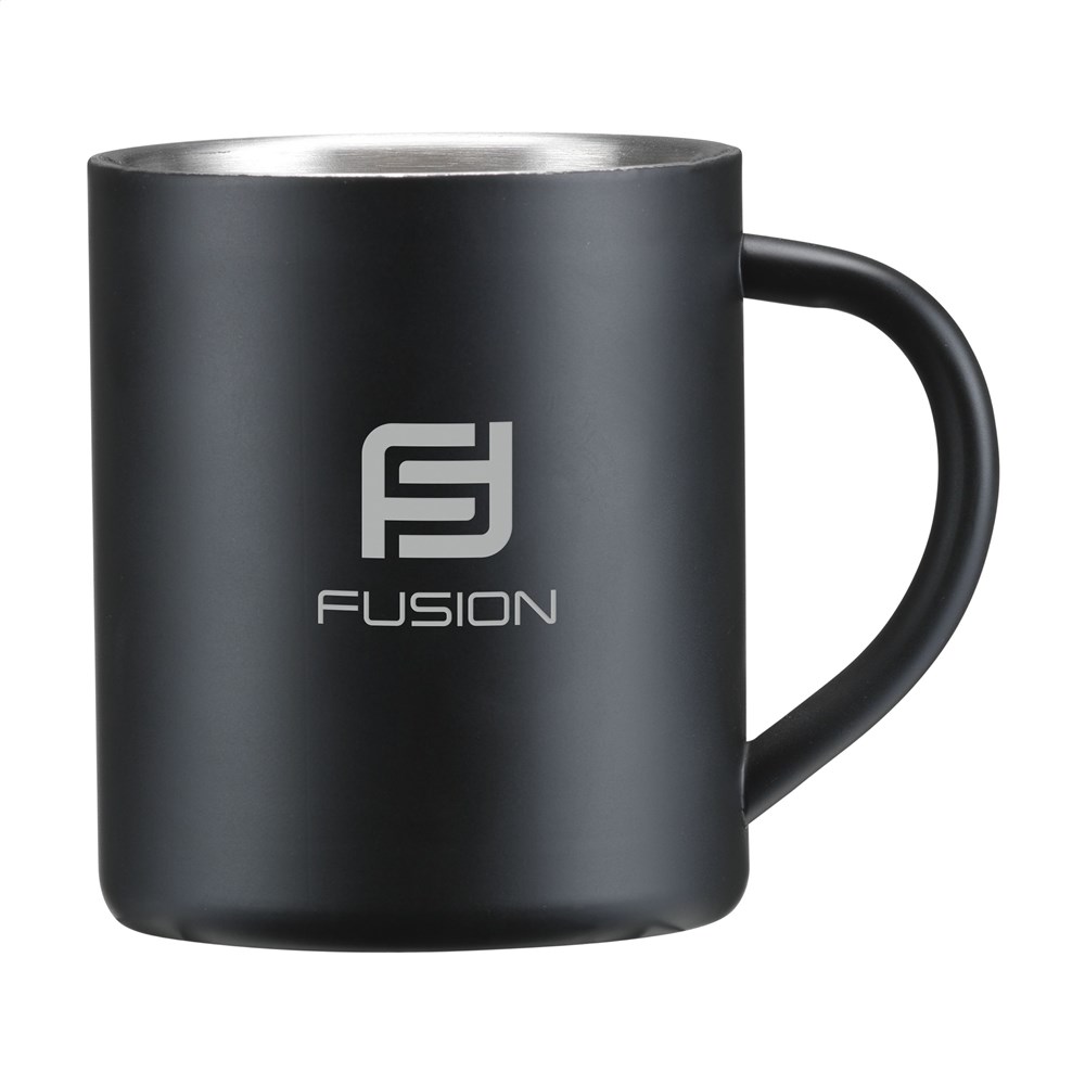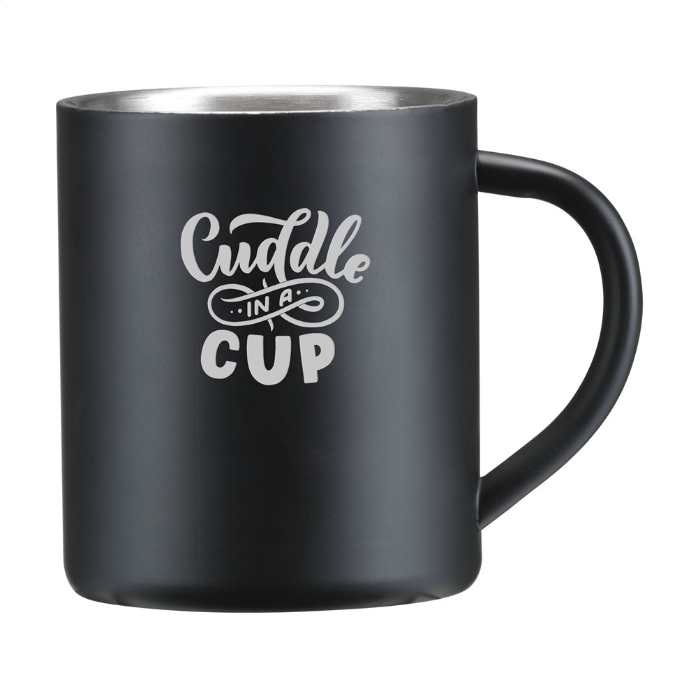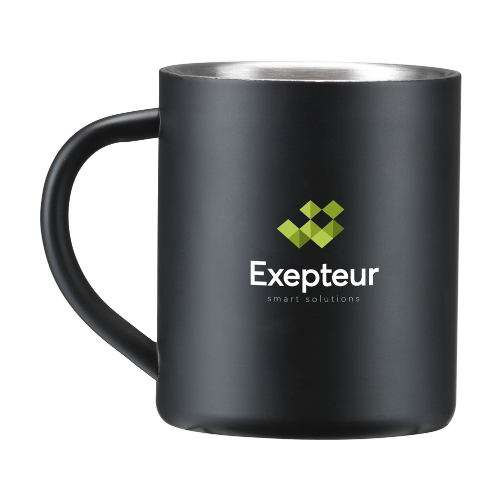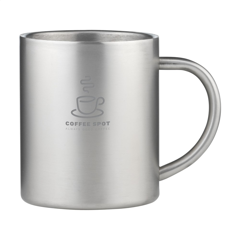 Dubbelwandige, gepolijste RVS mok. Inhoud 300 ml. De RVS mok is vaatwasserbestendig, de RVS mok met zwarte toplaag (5404.98) is niet vaatwasserbestendig. Per stuk in doos.
