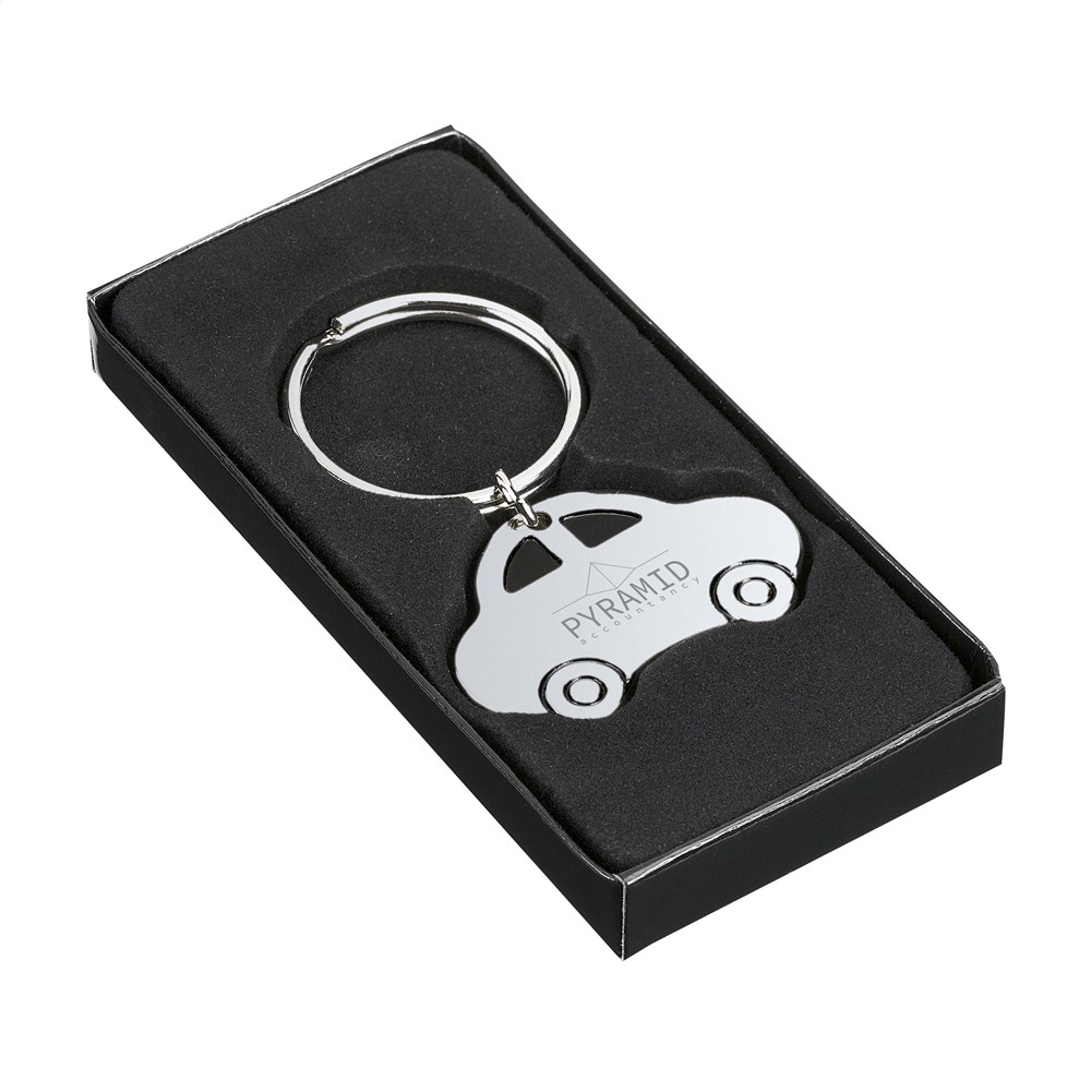 Metalen autootje met stevige sleutelring. Per stuk in doosje.