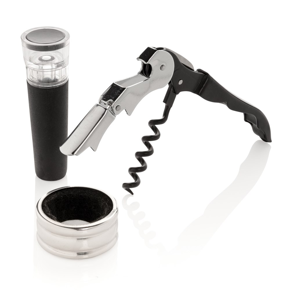 Alles wat je nodig hebt om je favoriete wijnen te openen en te serveren met deze 3-delige wijnset. De set bestaat uit een kurkentrekker, wijnstopper en een druppelring. Verpakt in een luxe geschenkverpakking.