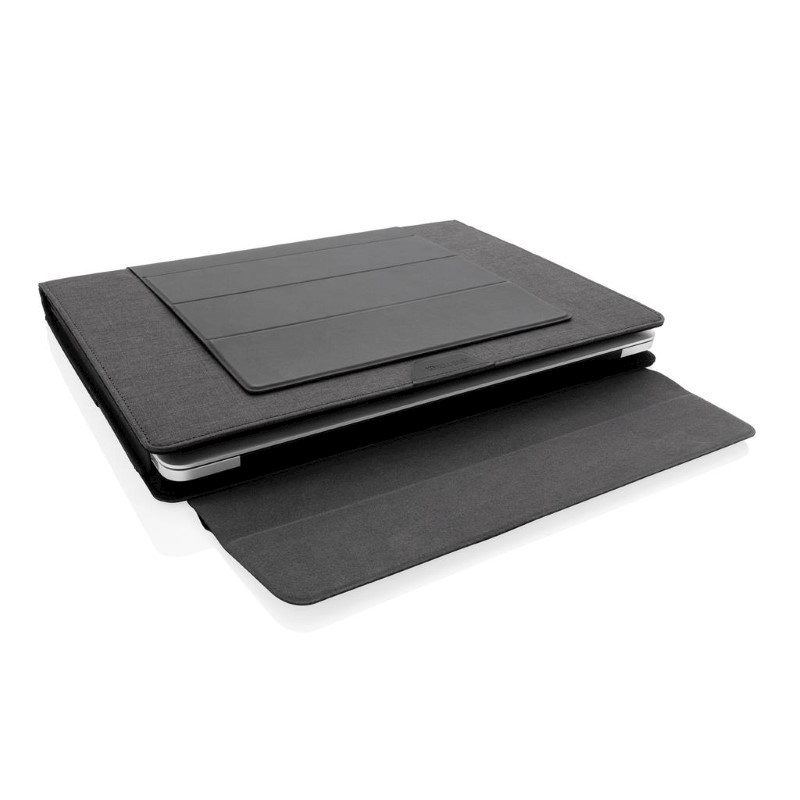 Creëer uw kantoor altijd en overal met deze praktische 2-in-1 laptophoes en werkstation. De laptophoes verandert gemakkelijk in een mobiel kantoor, zodat u overal comfortabel kunt werken. Blijf georganiseerd met de extra opbergvakken en penlussen waarmee u uw andere kantoorbenodigdheden kunt meenemen. Prachtig vormgegeven met een materiaalmix van RPET en PU. In de laptophoes past een 15,4 inch laptop.