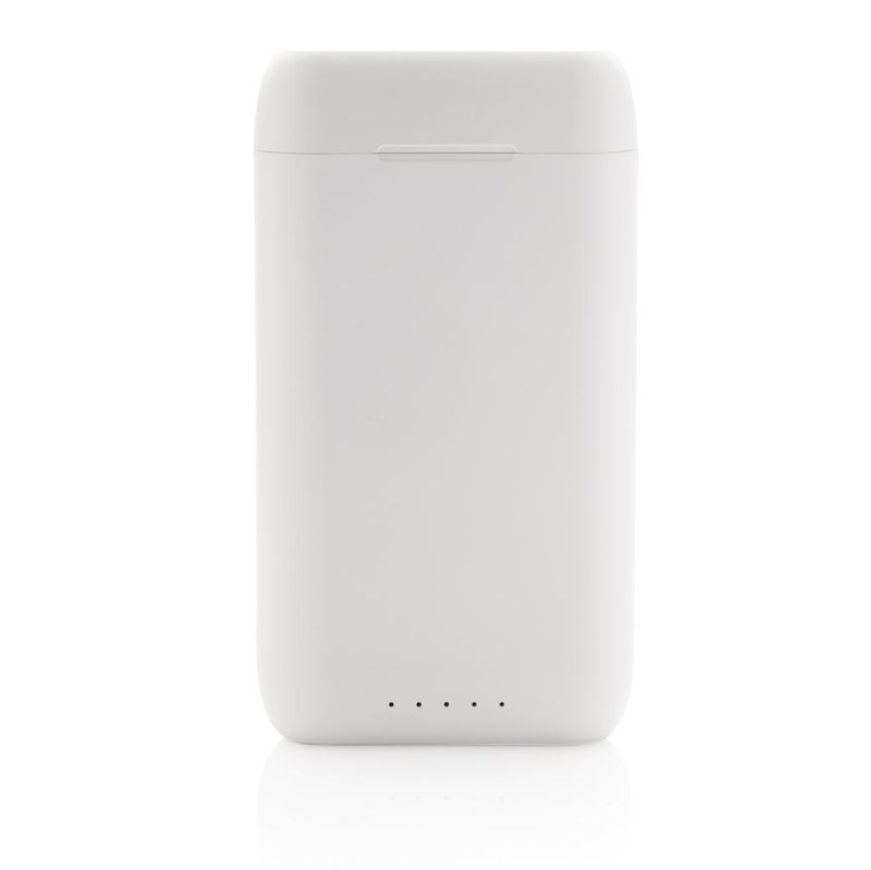 Unieke 2 in 1 design powerbank met geïntegreerde TWS oordopjes. Oordopjes en behuizing van ABS-materiaal. Inclusief oplaadlampje. De oordopjes gebruiken BT5.0 voor een soepele en gemakkelijke verbinding van de oordopjes met je telefoon. De oordopjes hebben een 40 mAh batterij waarmee je tot 2 uur kunt spelen. Te herladen in 4 uur. Werkafstand oortjes tot 10 meter. De powerbank bevat een duurzame lithium-polymeerbatterij van 5.000 mAh waarmee u uw mobiele apparaat tot 2 keer kunt opladen. Type C input 5V/2A. USB output 5V/2A. Inclusief PVC-vrije TPE-materiaalsoort type C voor opladen.