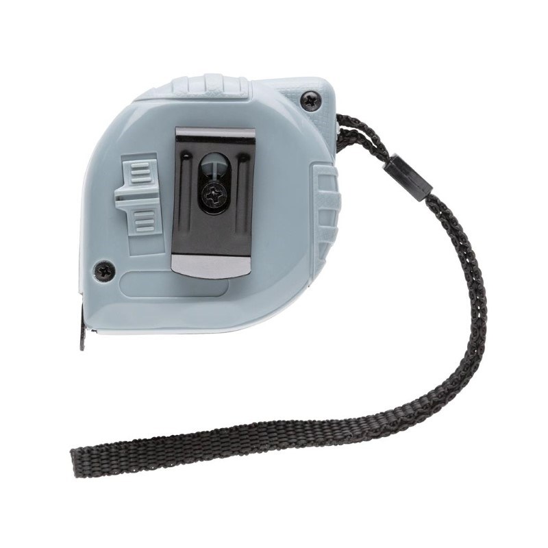 Compact 5 meter/19 mm meetlint De behuizing is circa 30% kleiner dan de meeste andere 5M-tapes. Daarom is deze tape perfect om mee te nemen. De tape is voorzien van een pauzeknop en een stopknop. De pauzeknop is perfect gepositioneerd om de flow van de tape met de duim te regelen (rechtshandig gebruik) Met riemclip en polsband. Behuizing van ABS-materiaal met rvs plaat.
