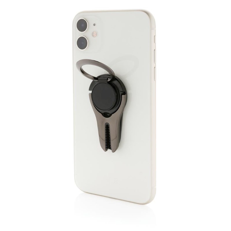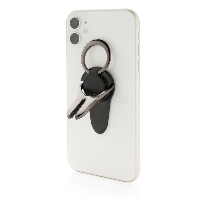 Telefoonhouder die eenvoudig aan de achterkant van uw scherm kan worden bevestigd. Eenmaal bevestigd, kan de ring worden gebruikt om uw telefoon vast te houden om scherm te bekijken of om als standaard te worden gebruikt. De ringhouder kan ook aan de ventilatieopening van uw auto worden bevestigd voor eenvoudige navigatie voor handsfree bellen. Inclusief plakband voor extra hechting mobiele telefoons met glazen behuizing zoals de iPhone 8-X. Aluminium materiaal en zinc alloy ring.