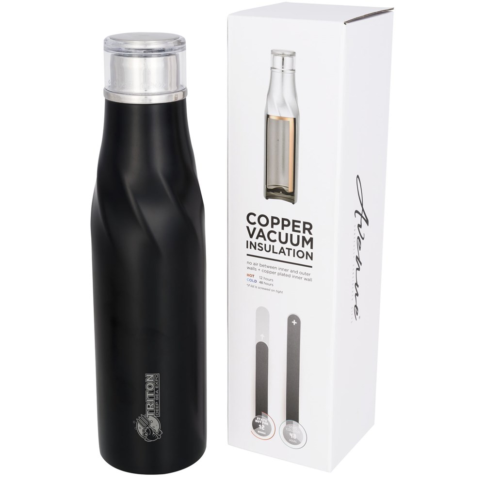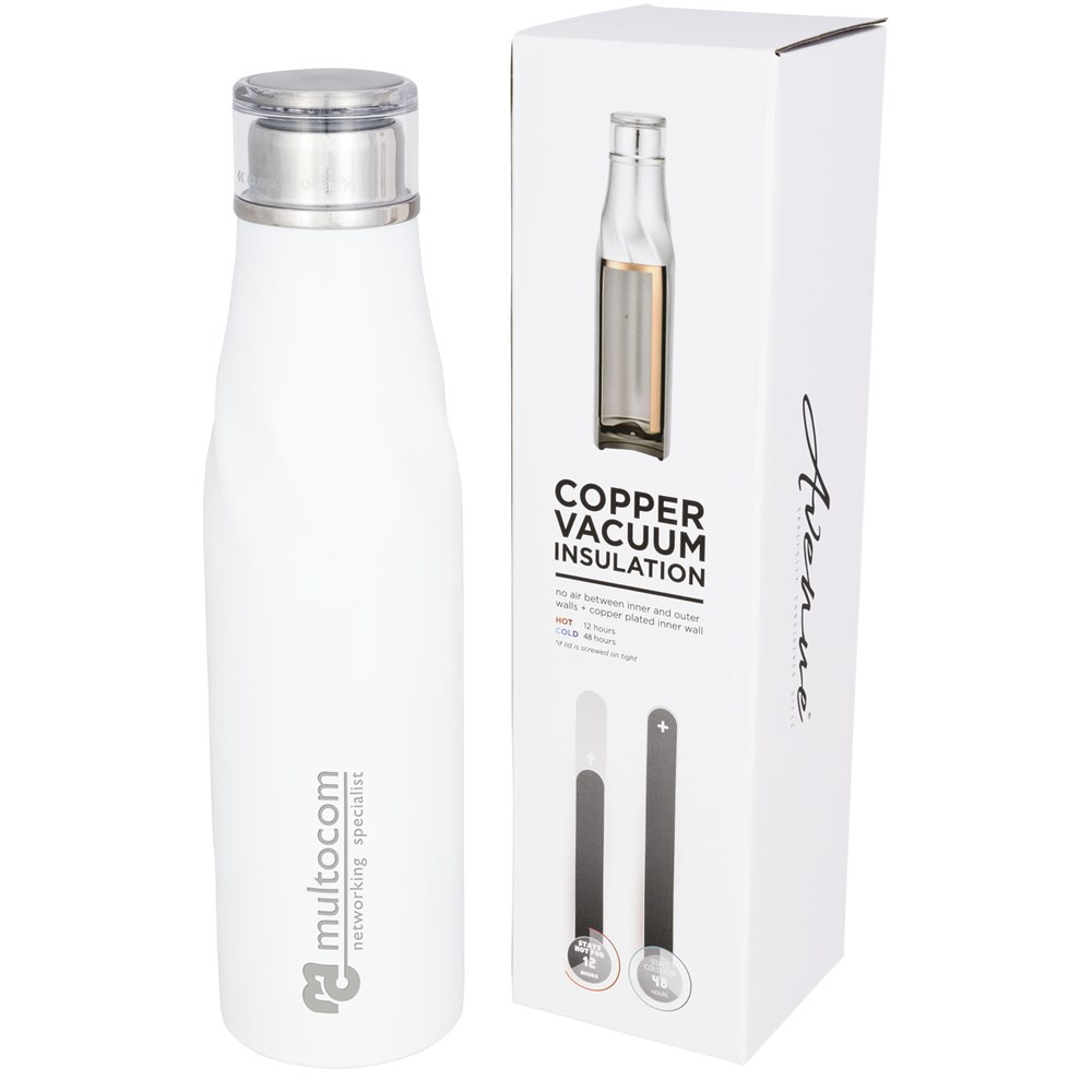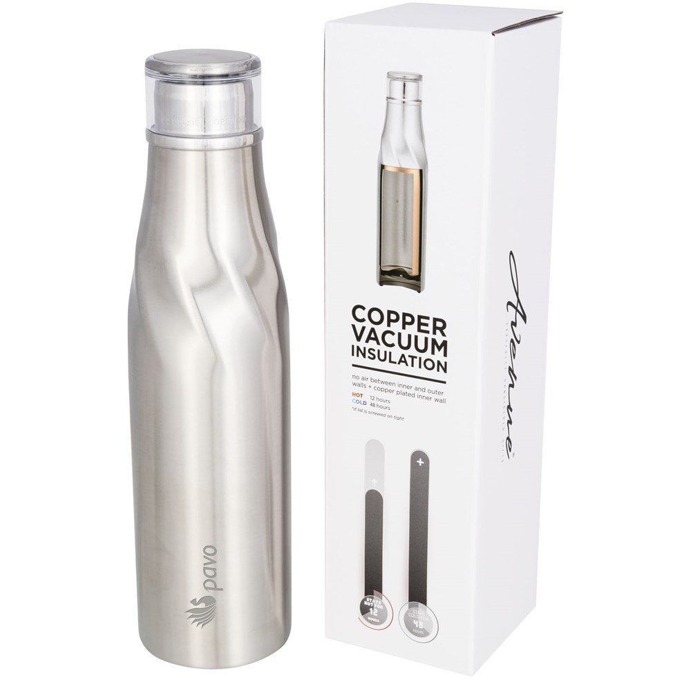 Ontwerp met zelfsluitende dop voor makkelijk openen en een comfortabelere drinkervaring. Brede opening voor comfortabel vullen en schenken. Duurzaam, dubbelwandig roestvrijstalen vacuüm constructie met koper isolatie, waarmee uw drankje warm blijft gedurende 12 uur en koud gedurende 48 uur met de zelfsluitende en morsbestendige dop. Capaciteit is 650ml. Gepresenteerd in een Avenue geschenkverpakking.