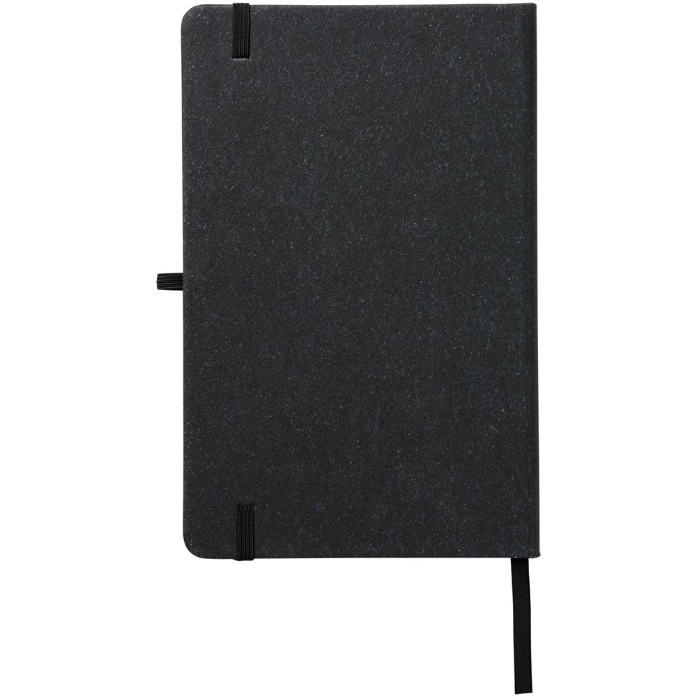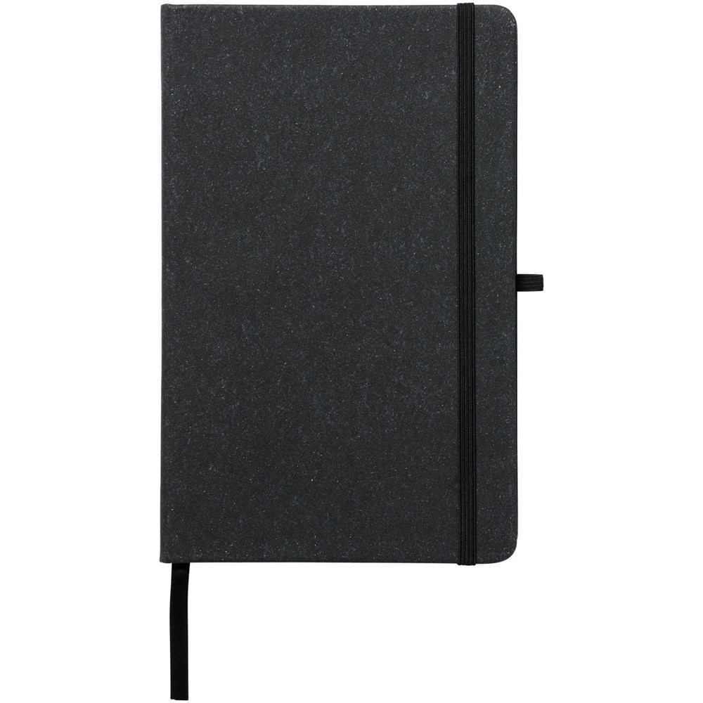Notitieboekje in A5 formaat met omslag van lederen restjes. Voorzien van een elastische band, pennenlus, lint als bladwijzer en 80 vellen, 80-grams gelinieerd papier.