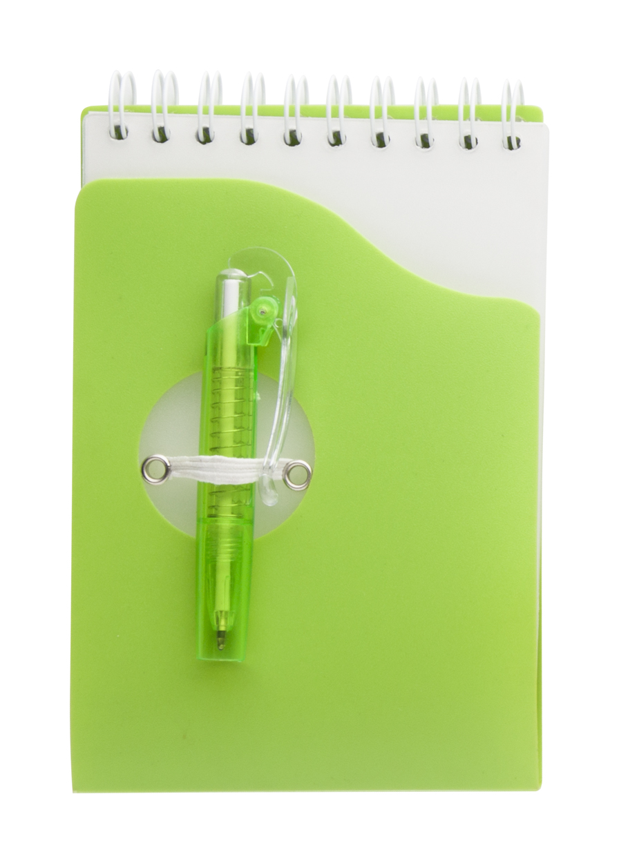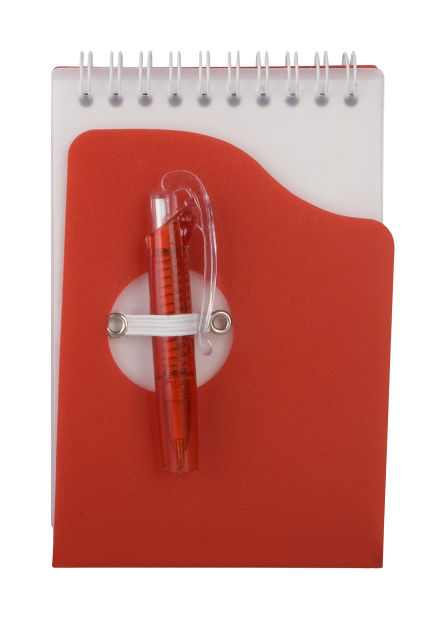 A4 formaat, notitieboek met 70 gelinjeerde velletjes met plastic cover. Plastic balpen blauw schrijvend.
