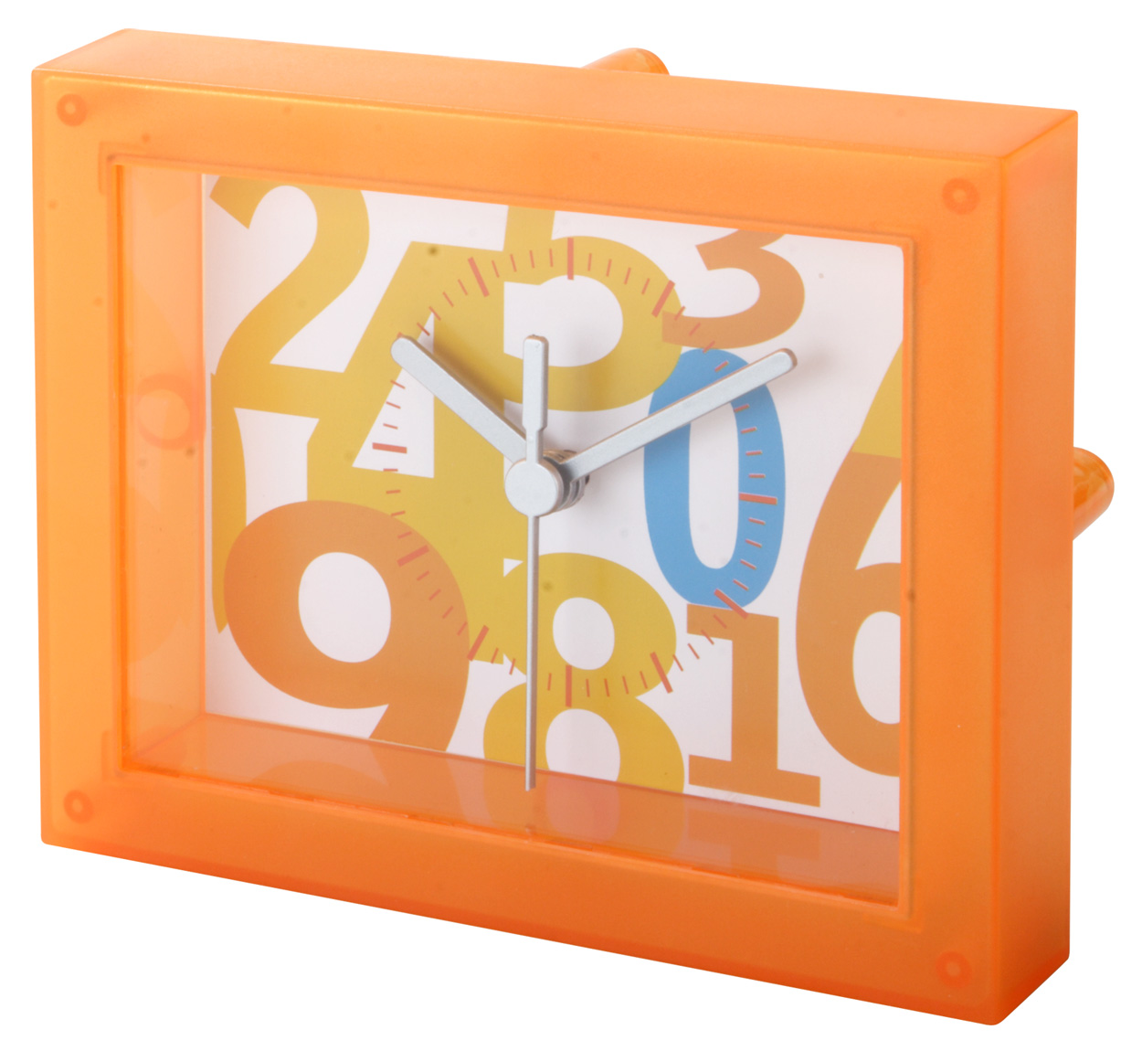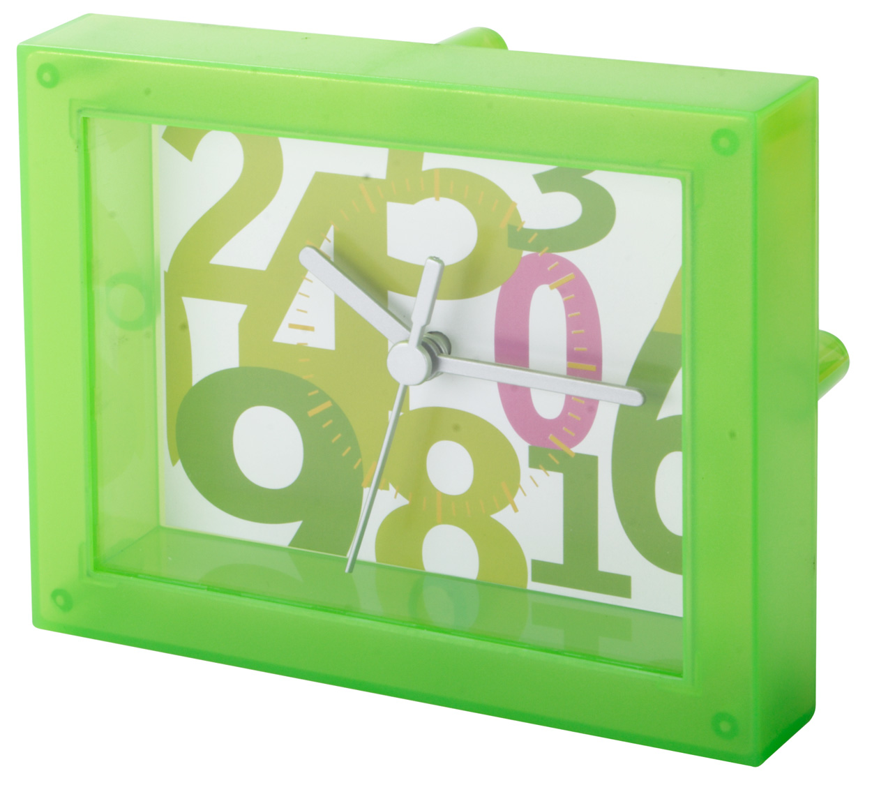 gekleurde plastic tafelklok, met patroon wijzerplaat. Zonder batterij.