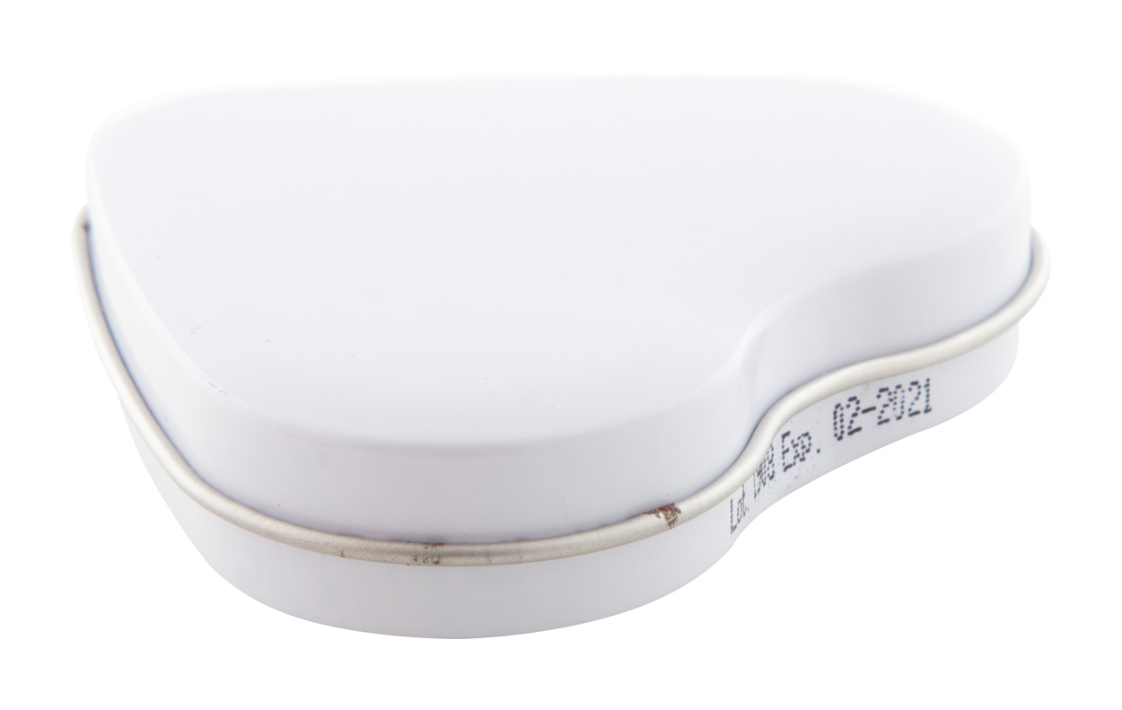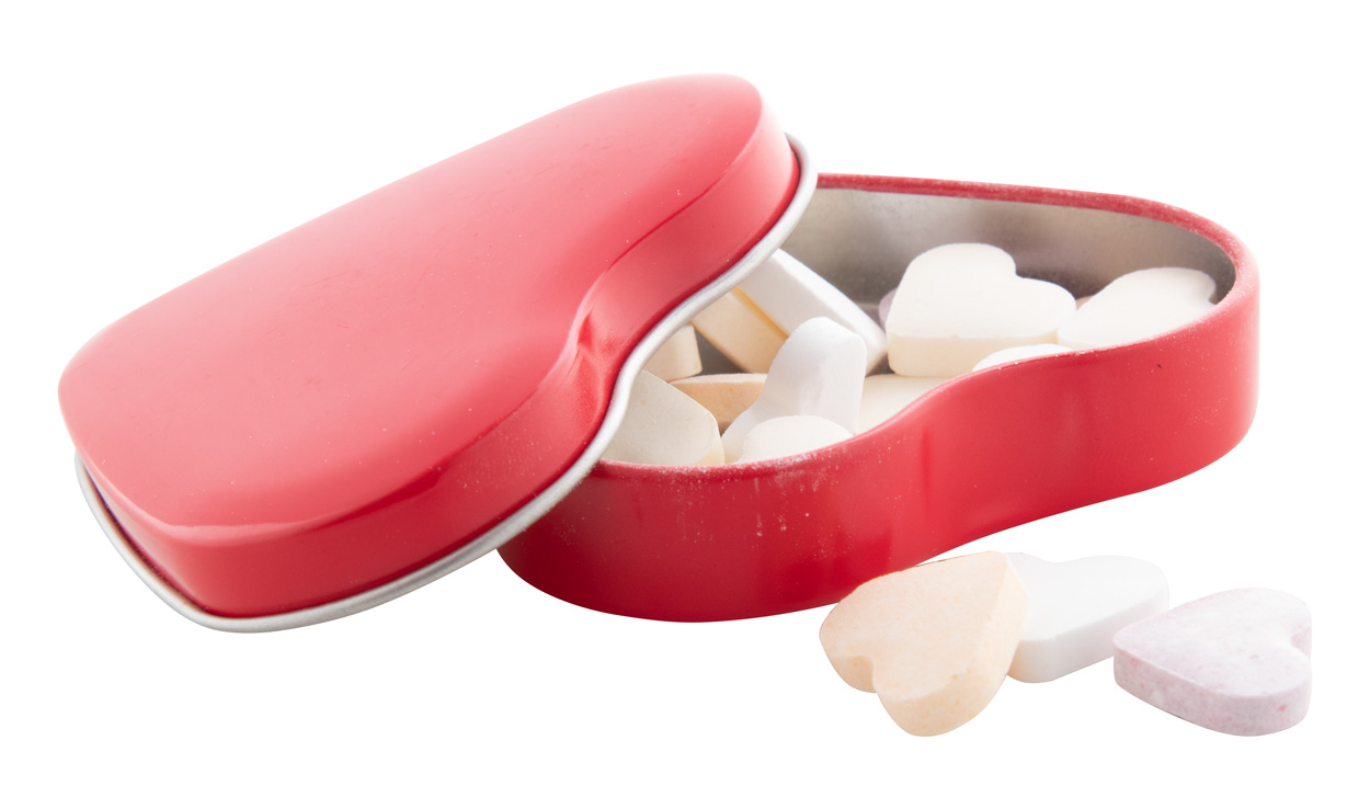 Hartvormige blikken doos met 24 gram hartvormige snoep.