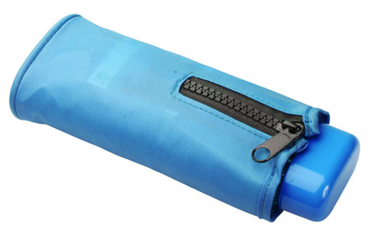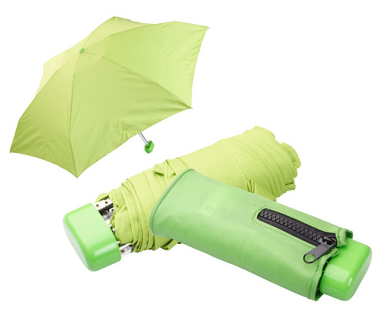 Niet-automatische, extra kleine telescopische paraplu met 6 panelen, in etui met ritssluiting. De gesloten kast: 70 × 160 × 40 mm.