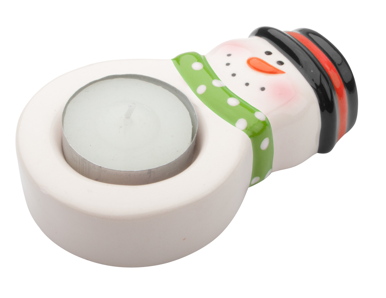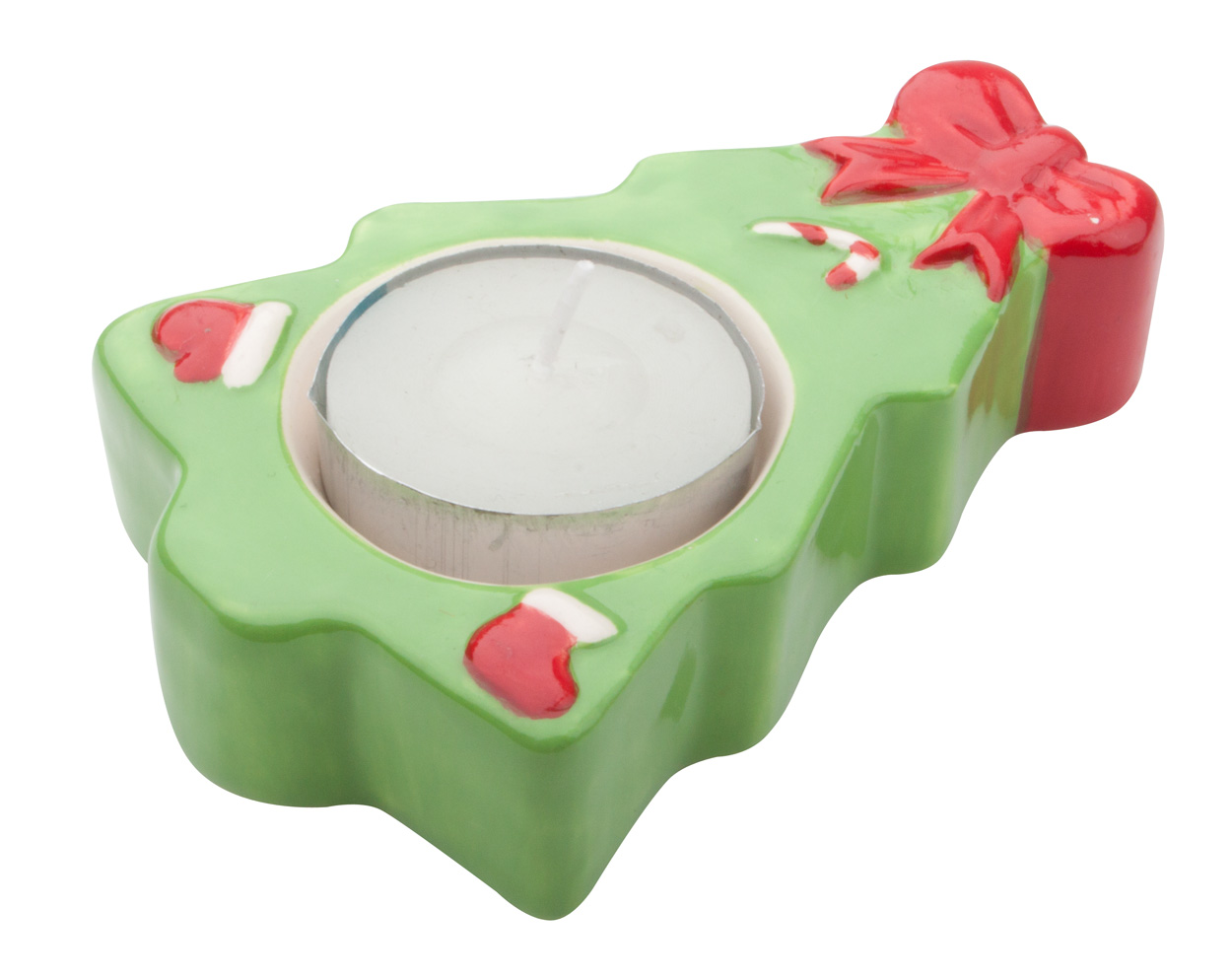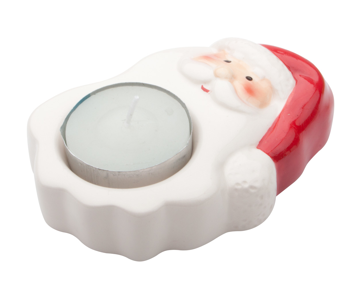 Ceramische waxinelichthouder met kerstdesign en waxinelicht.