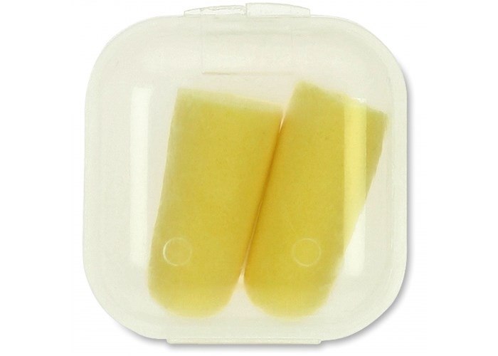 Twee zachte oordopjes handzaam verpakt in een transparant doosje. Bedrukking middels tampondruk op het doosje. De oordopjes zijn verpakt in een polybag.