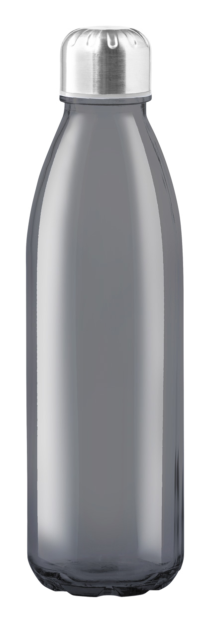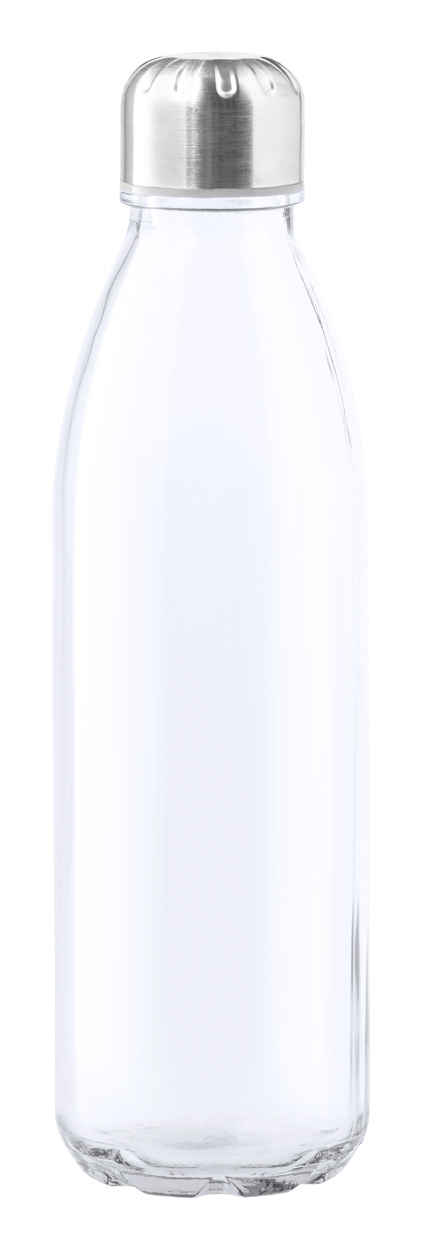 Flesvormige, transparante glazen sportfles met roestvrijstalen dop. Inhoud: 650 ml.