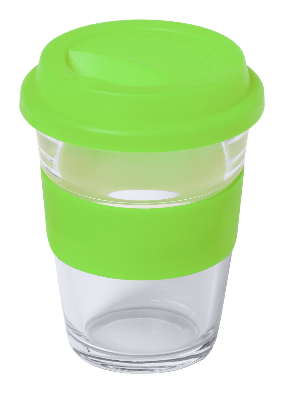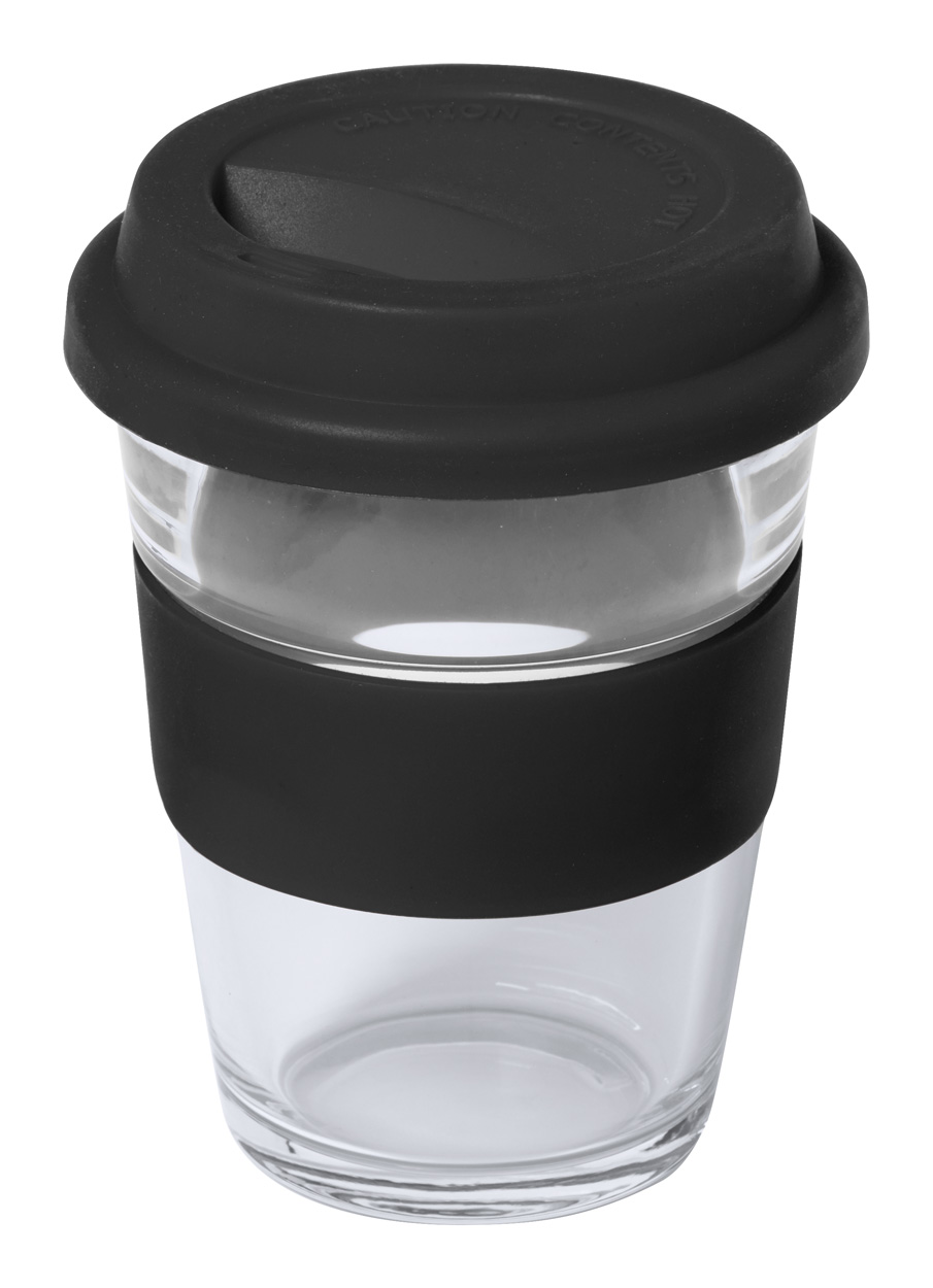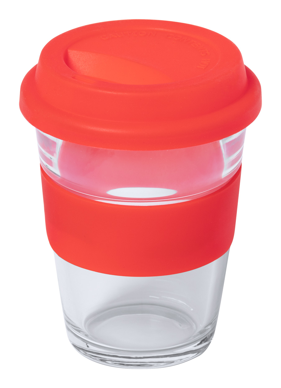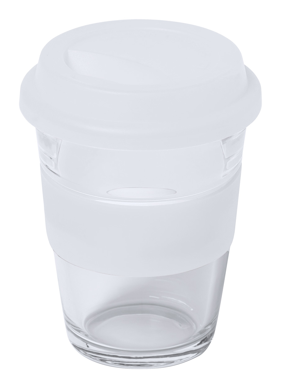 Enkelwandige glazen reismok met siliconen drinkdeksel en handgreep. Inhoud: 350 ml.