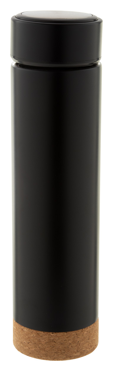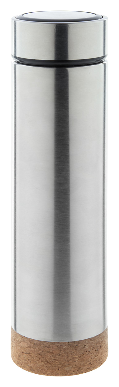 Dubbelwandige roestvrijstalen, geïsoleerde thermoskan met thee-ei en kurken bodem. Inhoud: 450 ml.