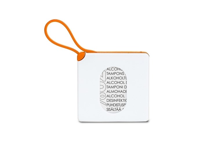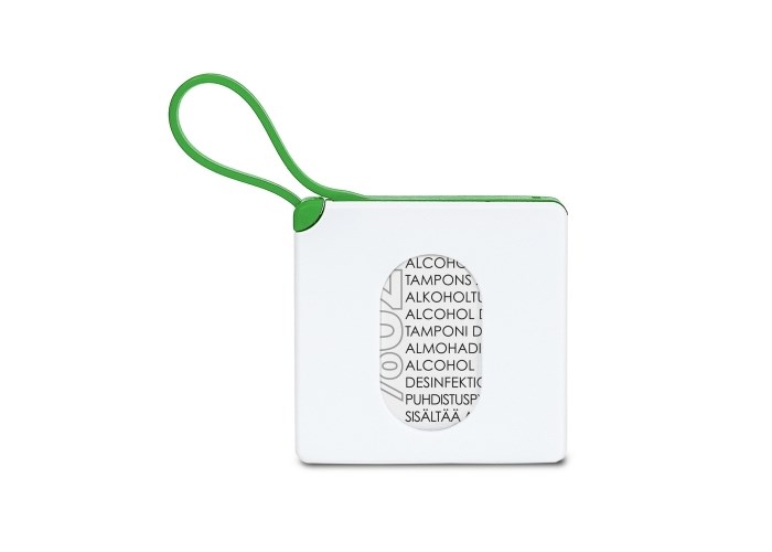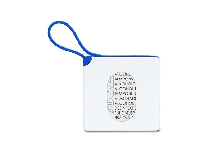 Compacte houder met 15 alcoholdoekjes (75% alcohol). De stevige houder beschermt de inhoud en kan nagevuld worden. De siliconen van sluit de houder af en kan ook gebruikt worden om het aan een tas of ander voorwerp te hangen.