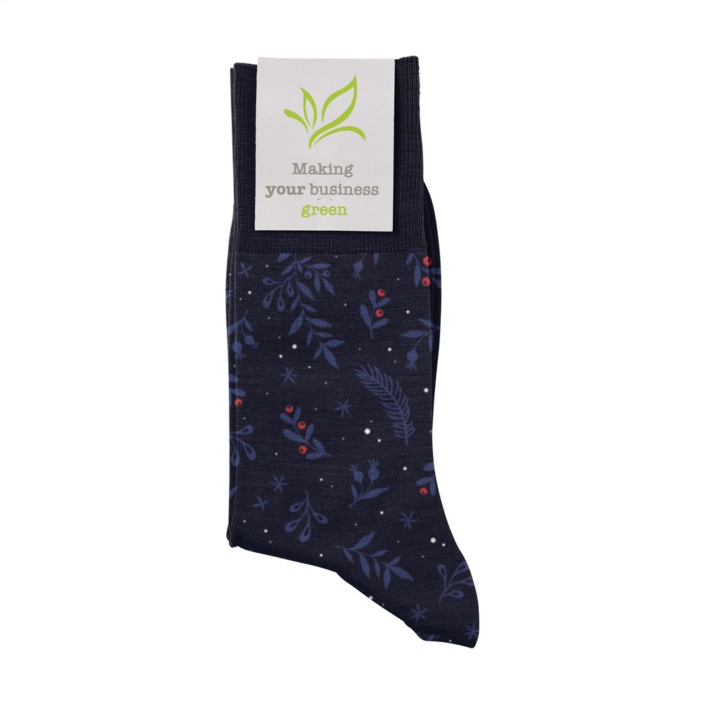 Sokken van gebreid katoen (80%), polyamide (15%) en lycra (5%). Inclusief ingebreid, customised design. Kies voor een subtiel patroon of voor een uitgesproken design over de gehele sok. Keuze uit 7 standaardkleuren garen. De sokken zijn aan elkaar bevestigd met een kartonnen label. Ook dit is te voorzien van een eigen, full colour design. Zo ontwerp je je eigen sokken, die perfect aansluiten bij jouw huisstijl en wensen. Verkrijgbaar in de maten XS (35-37), S (38-40), L (41-43) en XL (44-46). Wassen op max. 30 graden. Niet in de droger. Niet strijken.