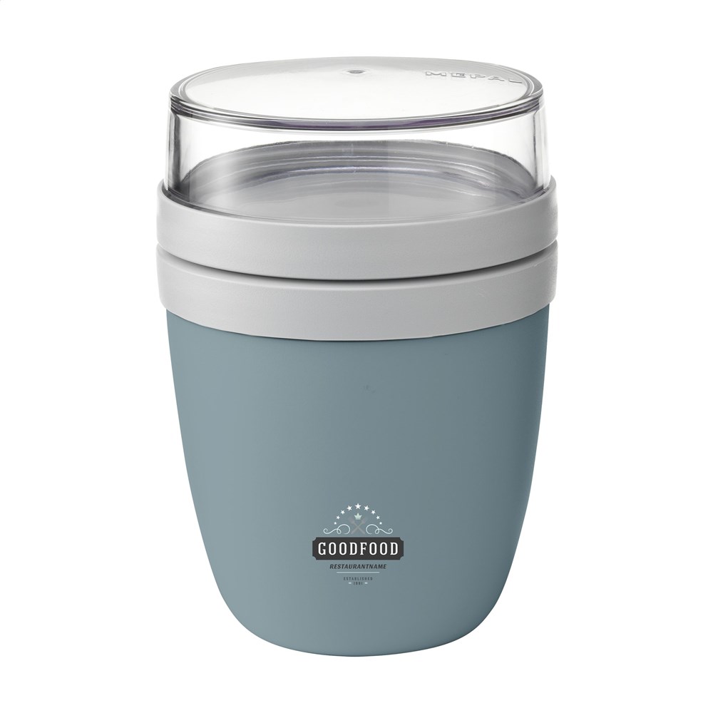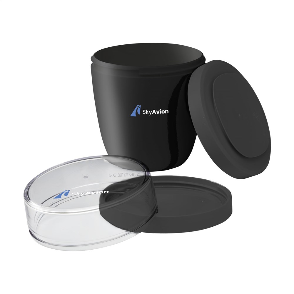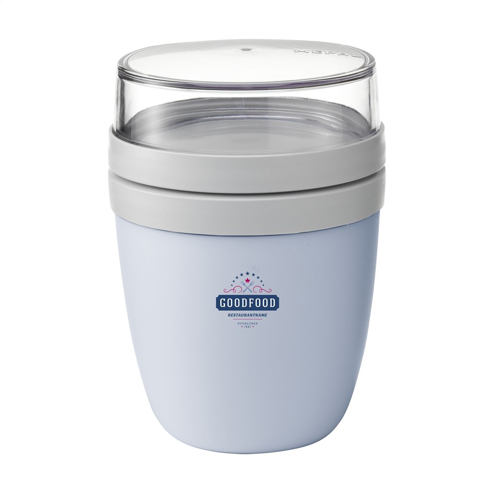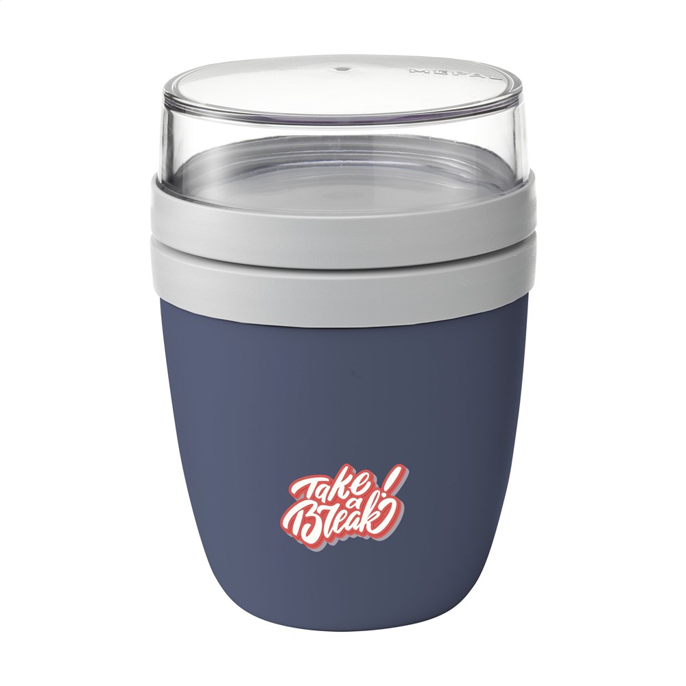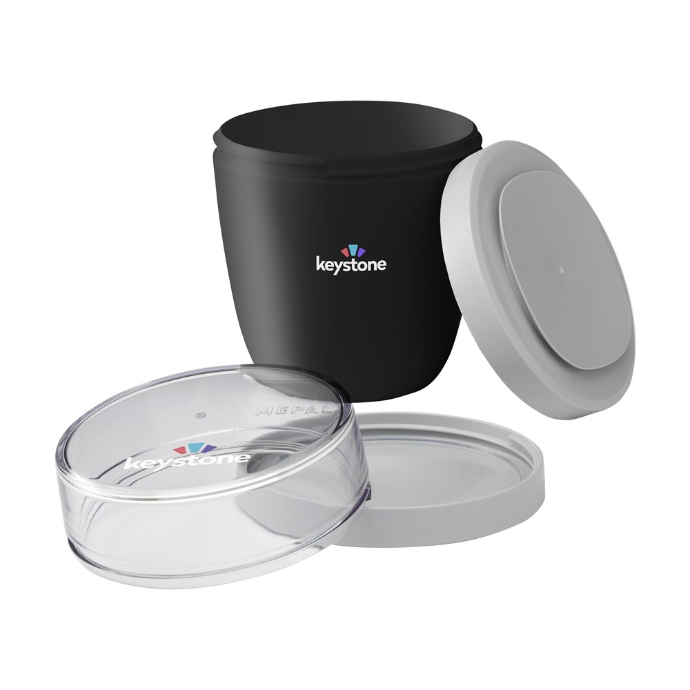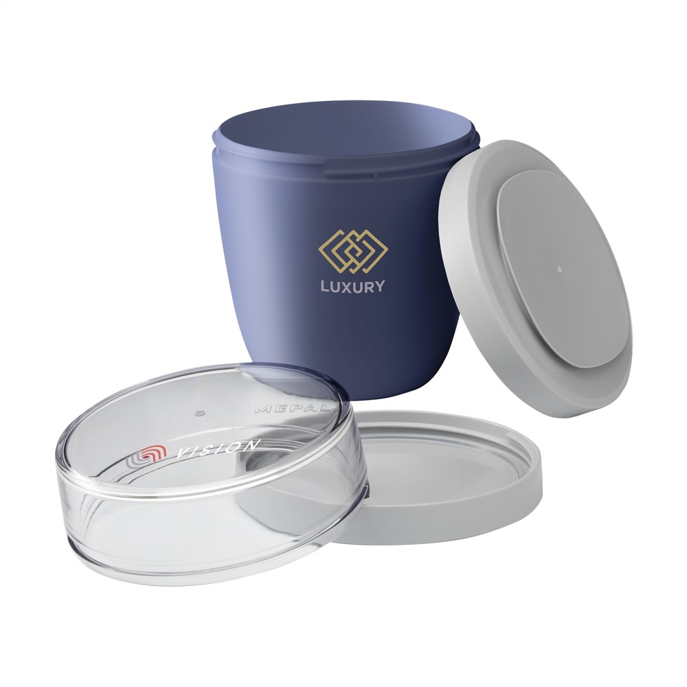 Deze duurzame, kunststof foodjar van het merk Mepal is een handig product om je lunch of tussendoortje mee te nemen. De foodjar heeft twee compartimenten. Door middel van een draaibeweging scheid je de twee compartimenten van elkaar. Beide delen hebben een aparte deksel. Dé oplossing om geknoei tijdens het mengen te voorkomen. De inhoud van het bovenste transparante compartiment is 200 ml, dit betekent dat er ongeveer 75 gram muesli of fruit in past. De inhoud van het onderste compartiment is 500 ml, genoeg voor een royale portie soep, noedels of yoghurt. Een hoogwaardig kwaliteitsproduct. BPA-vrij, Food Approved en lekvrij. Geschikt voor magnetron (deksel uitgezonderd) en vriezer. Met 2 jaar Mepal fabrieksgarantie. Made in Holland. VOORRAAD INFORMATIE: Tot 1.000 stuks beschikbaar binnen 10 werkdagen. Uitzonderingen voorbehouden.