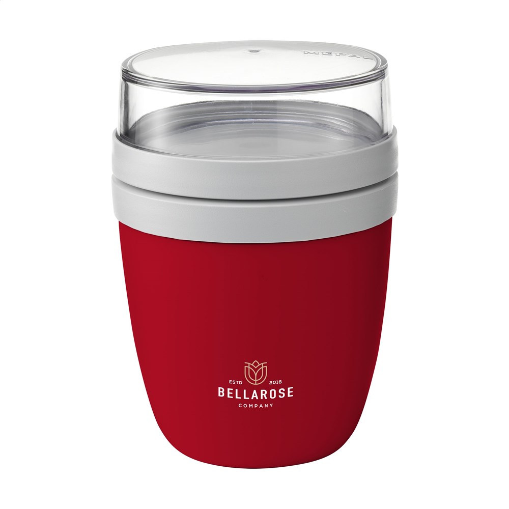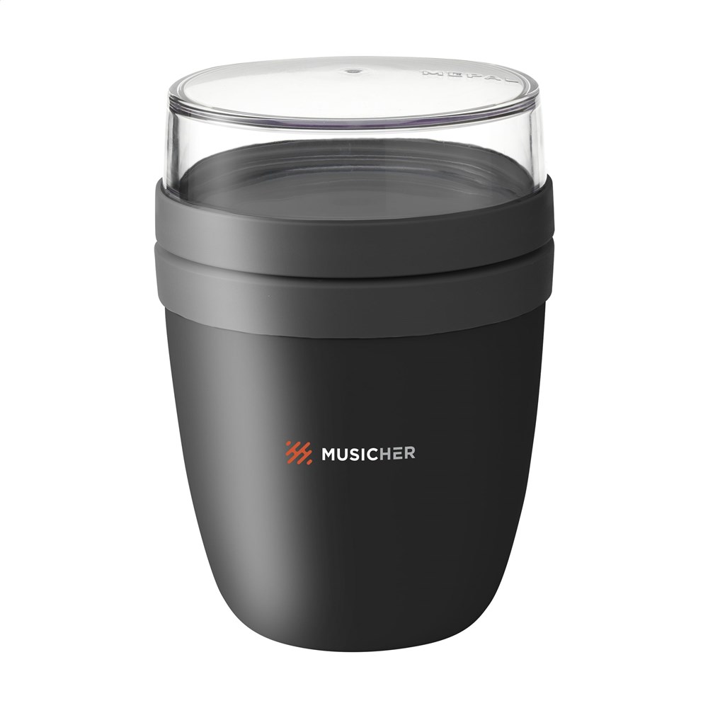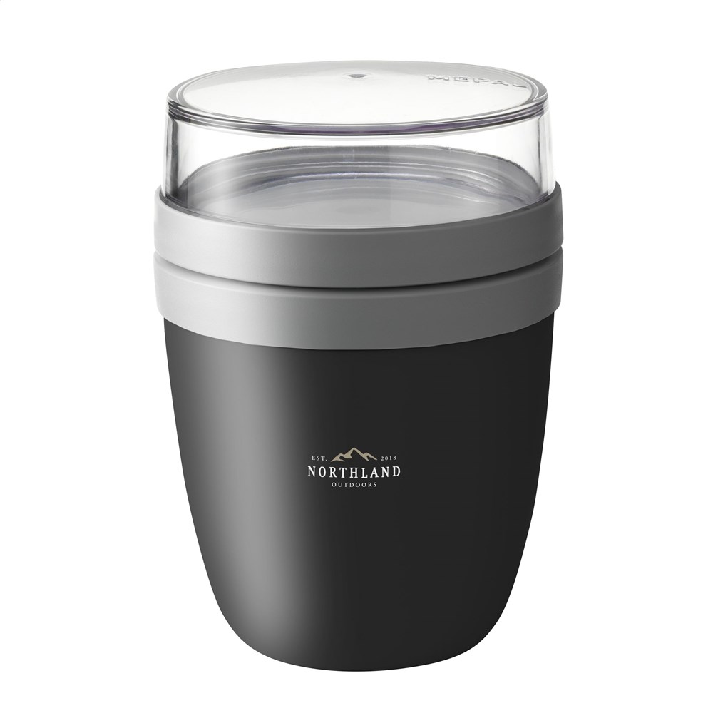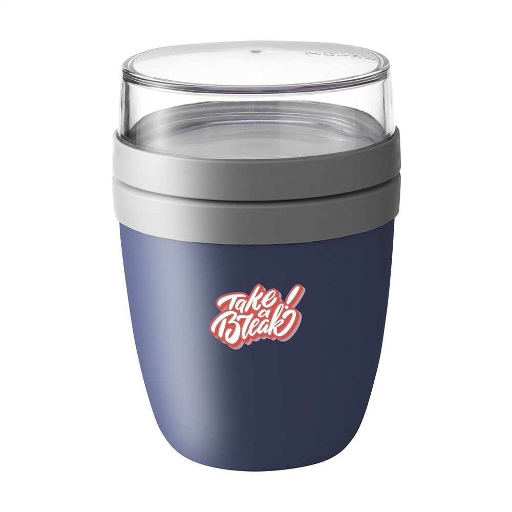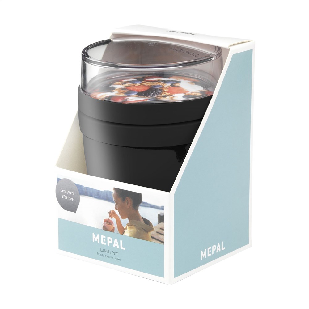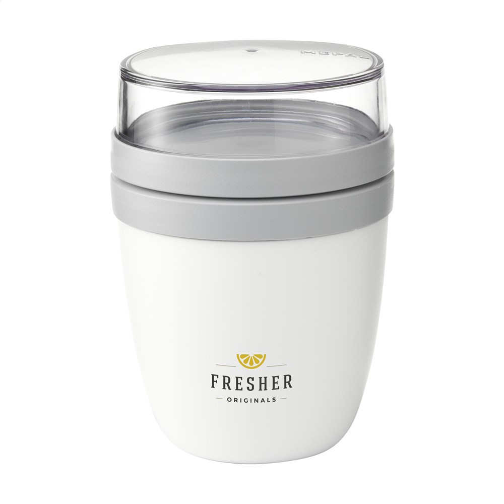 Deze duurzame, kunststof foodjar van het merk Mepal is een handig product om je lunch of tussendoortje mee te nemen. De foodjar heeft twee compartimenten. Door middel van een draaibeweging scheid je de twee compartimenten van elkaar. Beide delen hebben een aparte deksel. Dé oplossing om geknoei tijdens het mengen te voorkomen. De inhoud van het bovenste transparante compartiment is 200 ml, dit betekent dat er ongeveer 75 gram muesli of fruit in past. De inhoud van het onderste compartiment is 500 ml, genoeg voor een royale portie soep, noedels of yoghurt. Een hoogwaardig kwaliteitsproduct. BPA-vrij, Food Approved en lekvrij. Geschikt voor magnetron (deksel uitgezonderd) en vriezer. Met 2 jaar Mepal fabrieksgarantie. Made in Holland. VOORRAAD INFORMATIE: Tot 1.000 stuks beschikbaar binnen 10 werkdagen. Uitzonderingen voorbehouden.