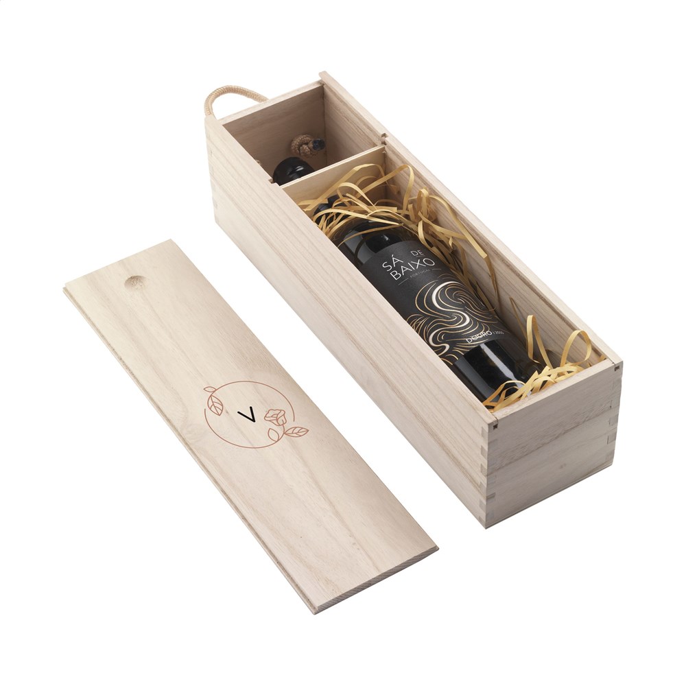 Wijnkist van paulowniahout. Met schuifdeksel en koord. Geschikt voor 1 fles wijn (0,75L). Het wijnkistje wordt geleverd exclusief wijn. Per stuk in kraft doos.