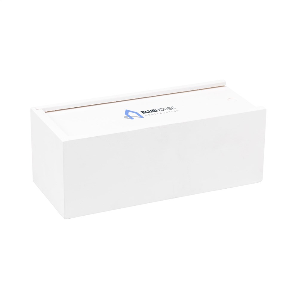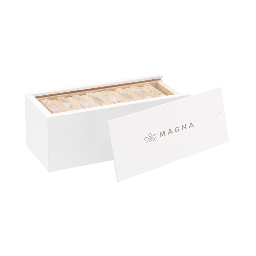 Houten stapelspel (48 blokjes). Afm. toren 15,5 x 6 x 6 cm. De blokken van dit gezelschapsspel zijn gemakkelijk op te bergen in de witte, houten box met schuifopening. Inclusief spelregels. Per stuk in kraft doos.