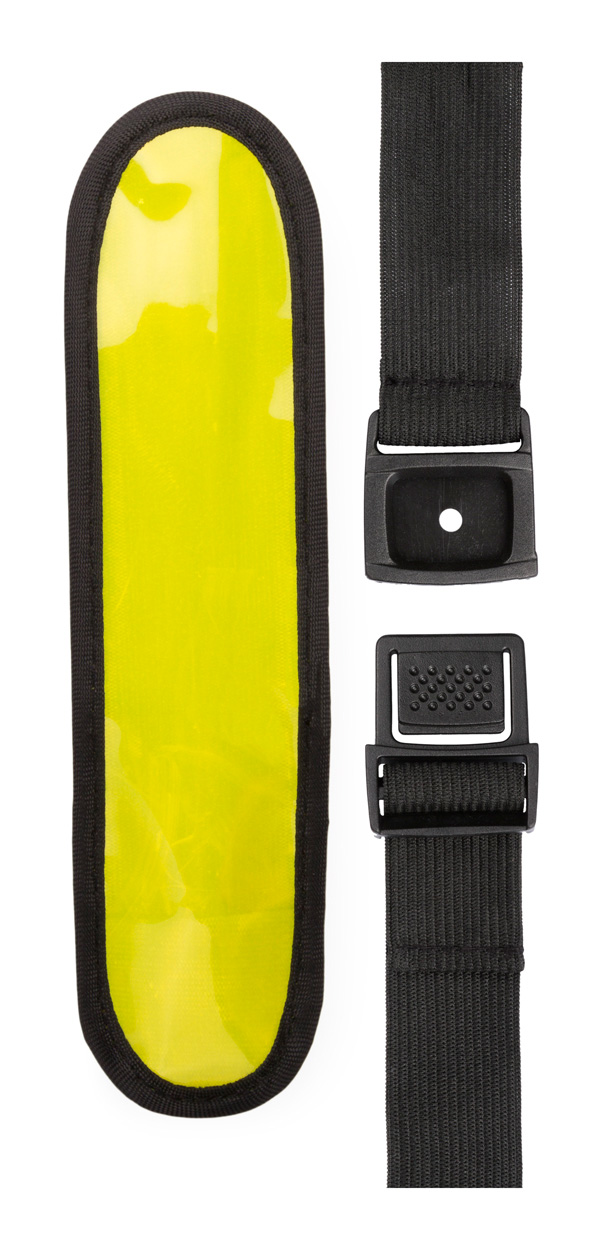 Reflecterende zichtbaarheidband met elastische banden en één 1 LED lamp. Gemaakt van polyester en PVC. Met knoopcel batterijen.