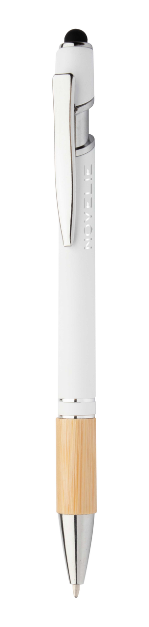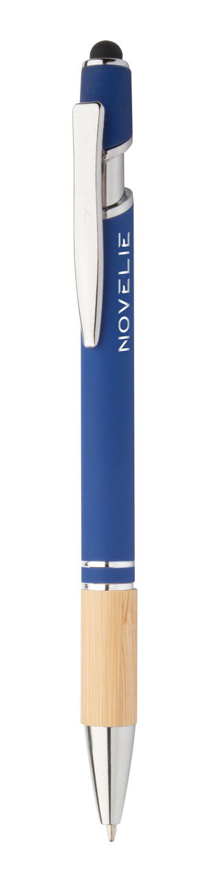 Aluminium balpen en touch screen pen met bamboe grip en rubberen afwerking. Met speciale coating voor spiegellasergravure. Blauwschrijvend.