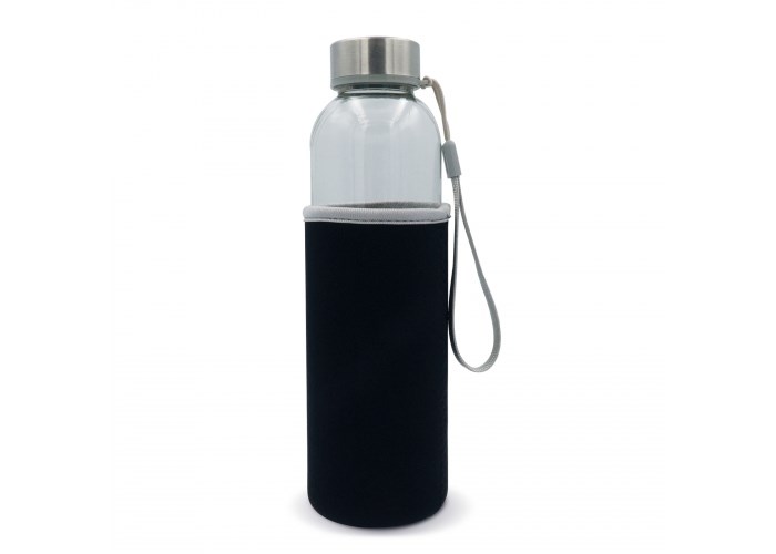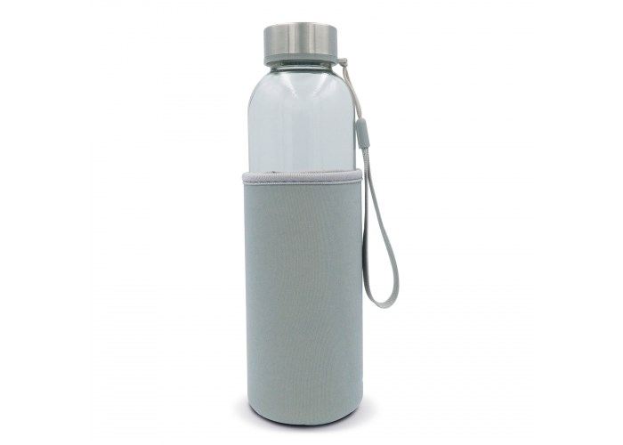 Glazen waterfles met sleeve. De fles zorgt er voor dat dranken langer koel blijven door middel van de sleeve er om heen. Inclusief een bandje aan de dop voor het eenvoudig vasthouden van de fles. Geschikt voor koude, koolzuurhoudende en niet-koolzuurhoudende dranken. Wordt verpakt in geschenkverpakking.