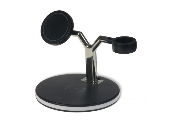 Dit 3-in-1 laadstation organiseert het bureau, nachtkastje of de woonkamer in één oogopslag. Door de mogelijkheid tot het draadloos laden, is het mogelijk om tot drie apparaten tegelijk op te laden. Laad een Apple Watch®, AirPods®, Magsafe iPhone® of een draadloos op te laden telefoon tegelijk op. Doordat alles met behulp van draadloos laden opgeladen kan worden, is er geen oplaadkabel meer nodig en is het een echte eye-catcher.