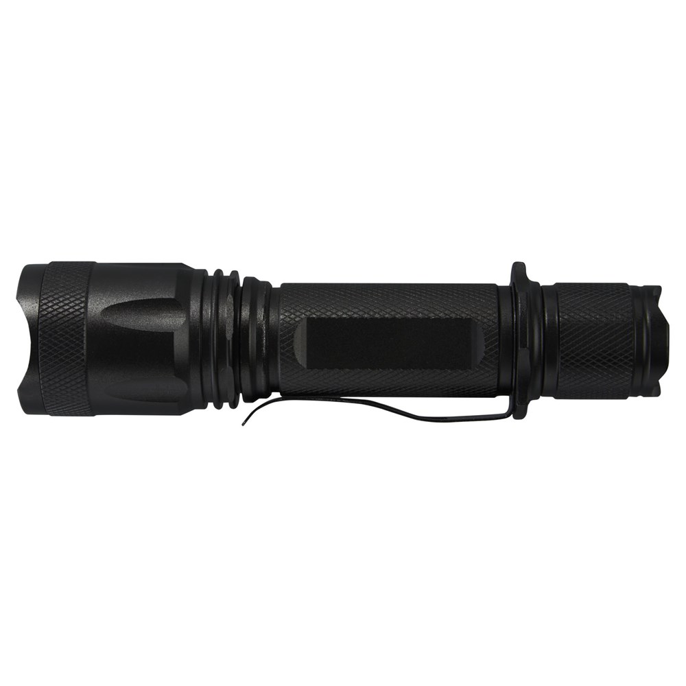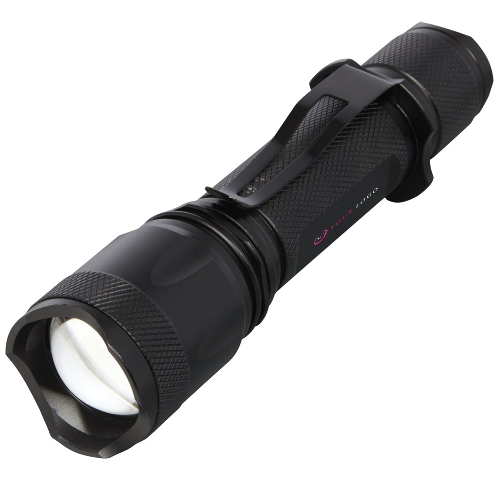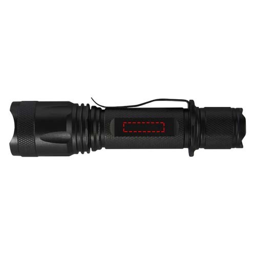 Kom nooit zonder batterij te zitten met deze oplaadbare, krachtige tactische aluminium zaklamp. De stevige zwarte behuizing van aluminiumlegering biedt een tactische uitstraling, met een schokbestendigheid van 1 meter. De zaklamp heeft een riemclip om gemakkelijk mee te nemen en is spatwaterdicht met een IPX4-classificatie. De 5 W led genereert 300 lumen voor maximaal 3 uur en heeft een straalafstand van 200 meter met 5 verschillende lichtstanden: hoog, medium, laag, stroboscoop en SOS. Het hoge vermogen komt van een ingebouwde lithiumbatterij met een capaciteit van 2000 mAh. De zaklamp heeft een afmeting van 14,5 x 3,4 cm en weegt slechts 170 gram. Wordt geleverd met een gebruiksaanwijzing en is verpakt in een geschenkverpakking van gerecycled karton met een afmeting van 17,5 x 6 x 4 cm. Lasergravure op de aluminium behuizing wordt aanbevolen.