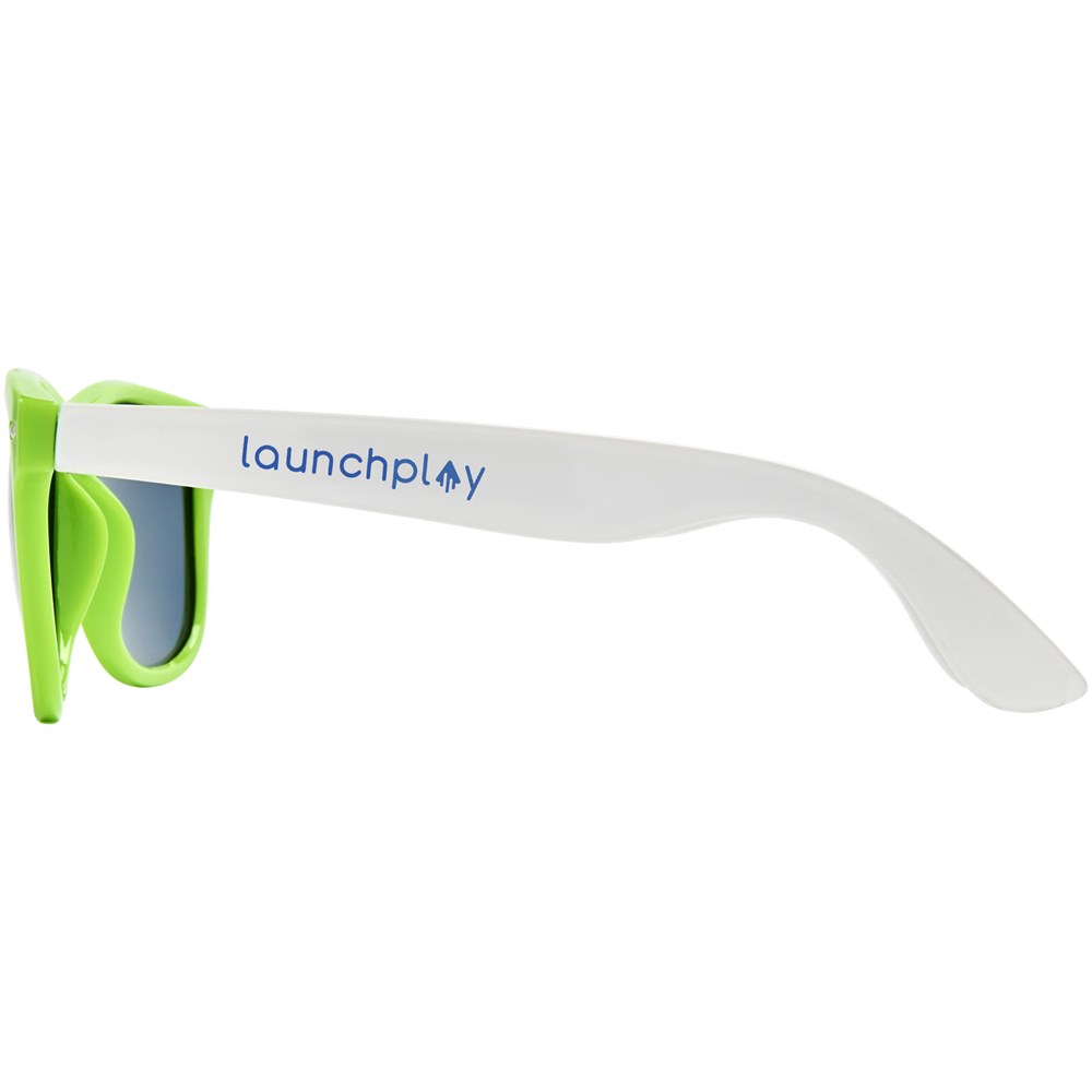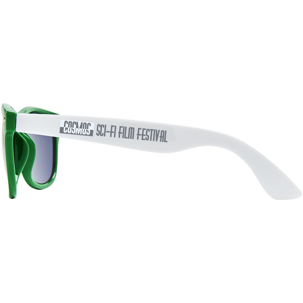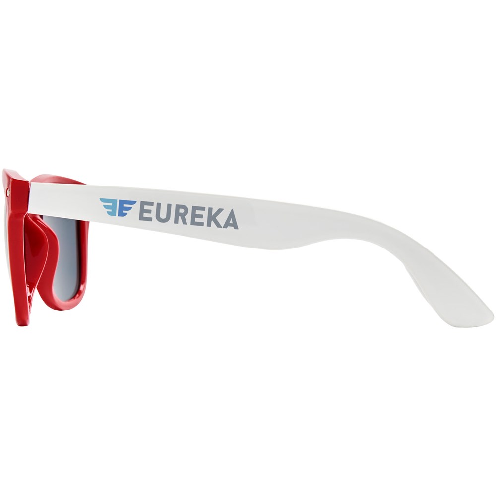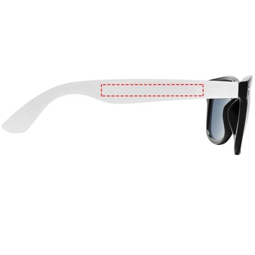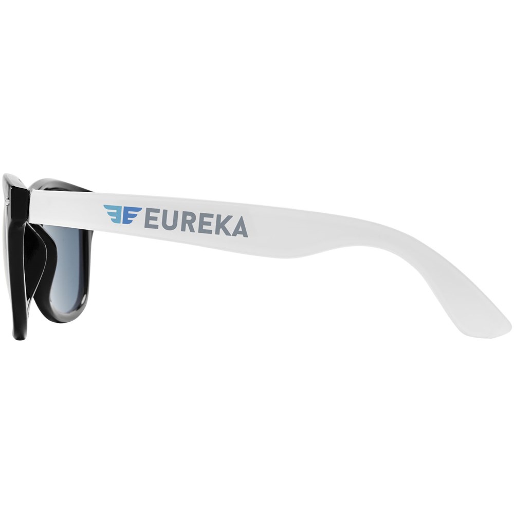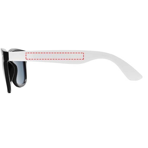 Sun Ray retro design zonnebril met witte pootjes voor een breed scala aan decoratie-opties. Voldoet aan EN ISO 12312-1 en UV-400, glazen zijn van klasse 3.
