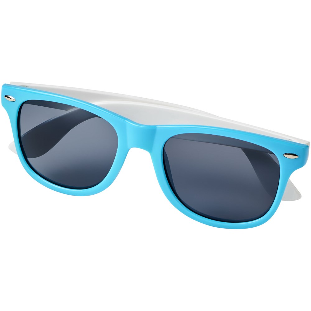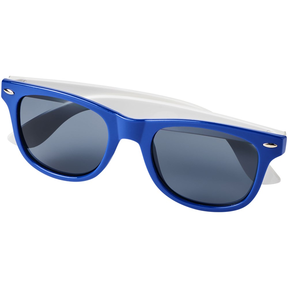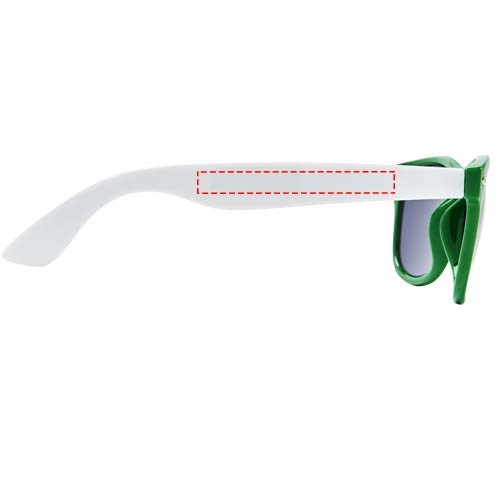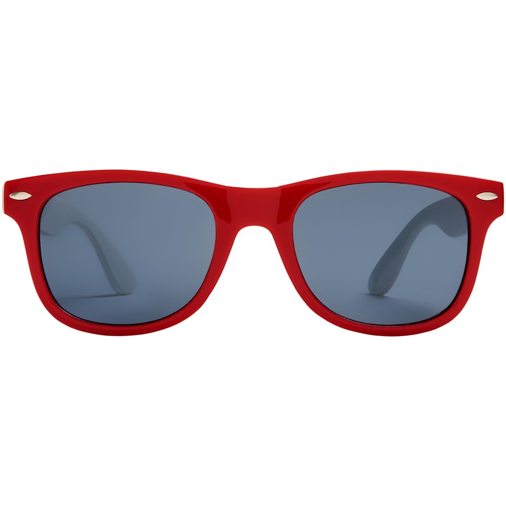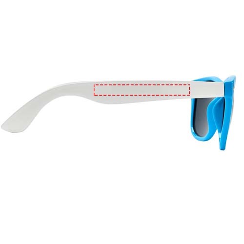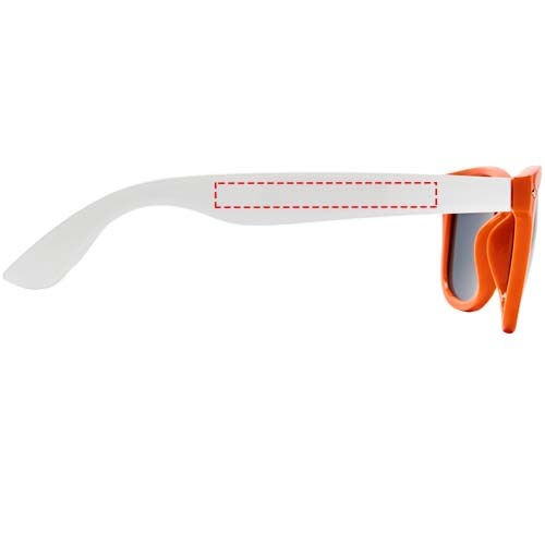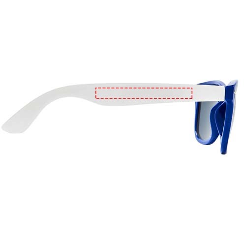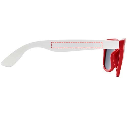 Sun Ray retro design zonnebril met witte pootjes voor een breed scala aan decoratie-opties. Voldoet aan EN ISO 12312-1 en UV-400, glazen zijn van klasse 3.