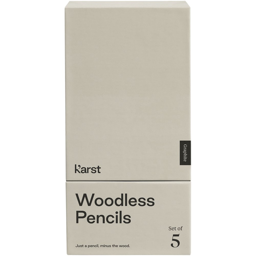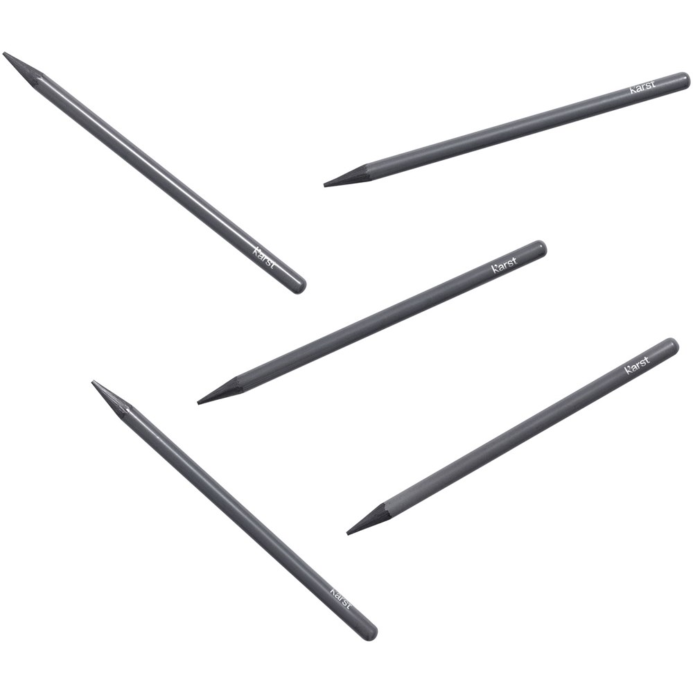 Set van 5 grafietpotloden met 5 keer meer grafiet per potlood. Het houtloze lichaam kan worden geslepen voor scherp lijnwerk of stomp worden gemaakt voor expressieve lijnen of subtiele arceringen. De houtloze constructie zorgt voor veelzijdigheid en bespaart de rommel van traditionele houtkrullen. Het stevige gewicht van deze potloden voelt luxueus aan in de hand, of u nu schrijft, krabbelt, schetst of tekent.