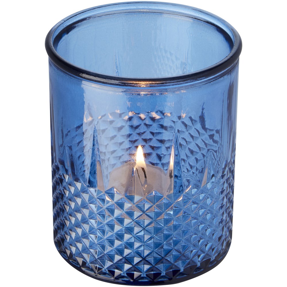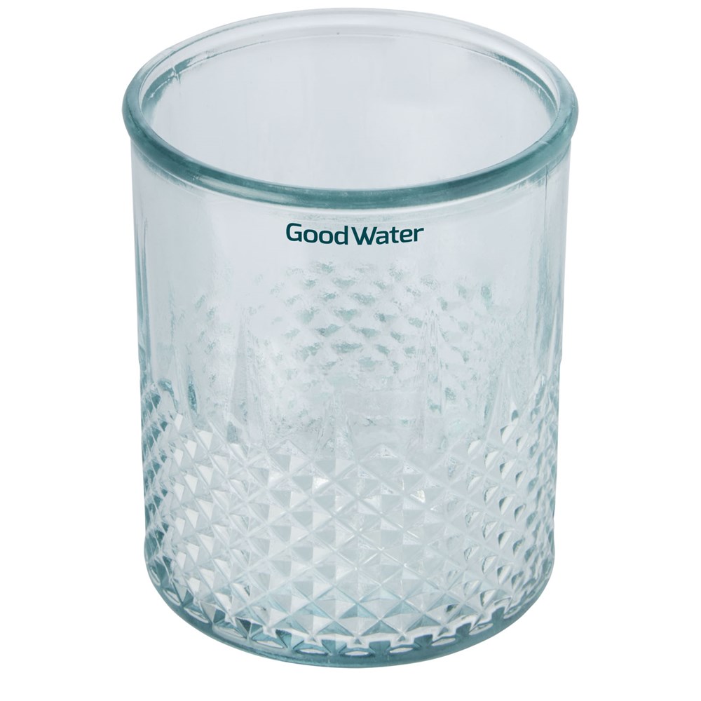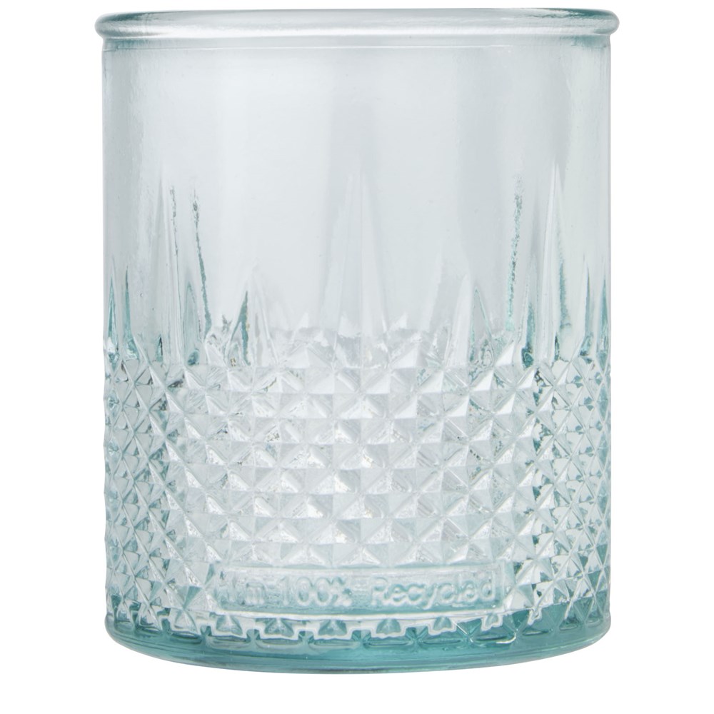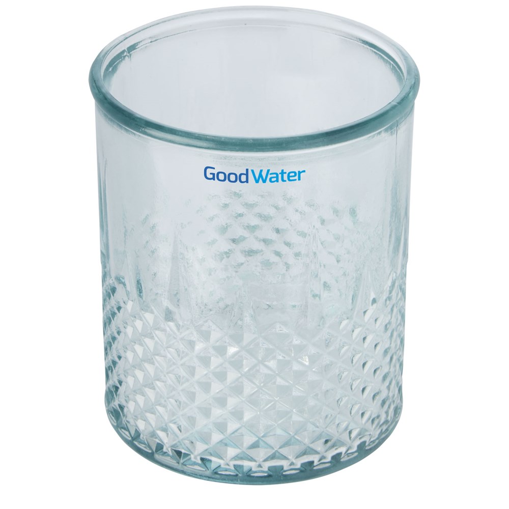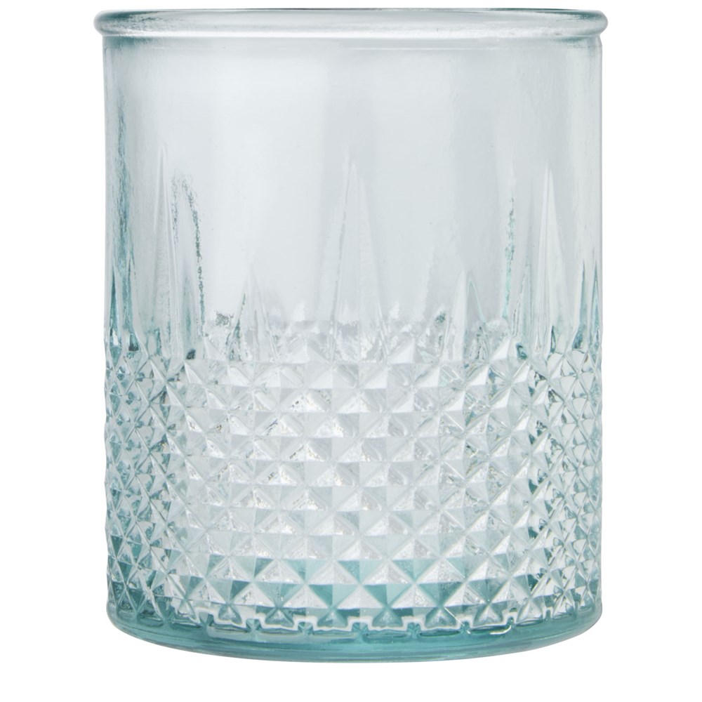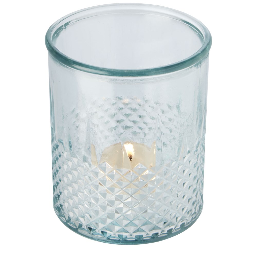 Theelichthouder van gerecycled glas met diamanteffect. Gemaakt van 1 glazen fles. Gerecycled glas wordt geproduceerd met minder energie, grondstoffen en toevoegingen, dan wat nodig is voor het maken van traditioneel glas. Theelichtje niet inbegrepen.