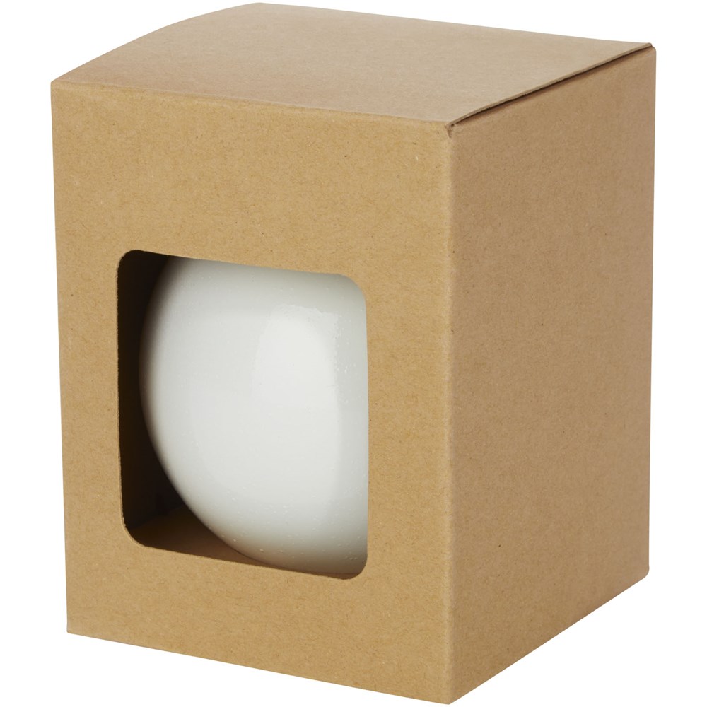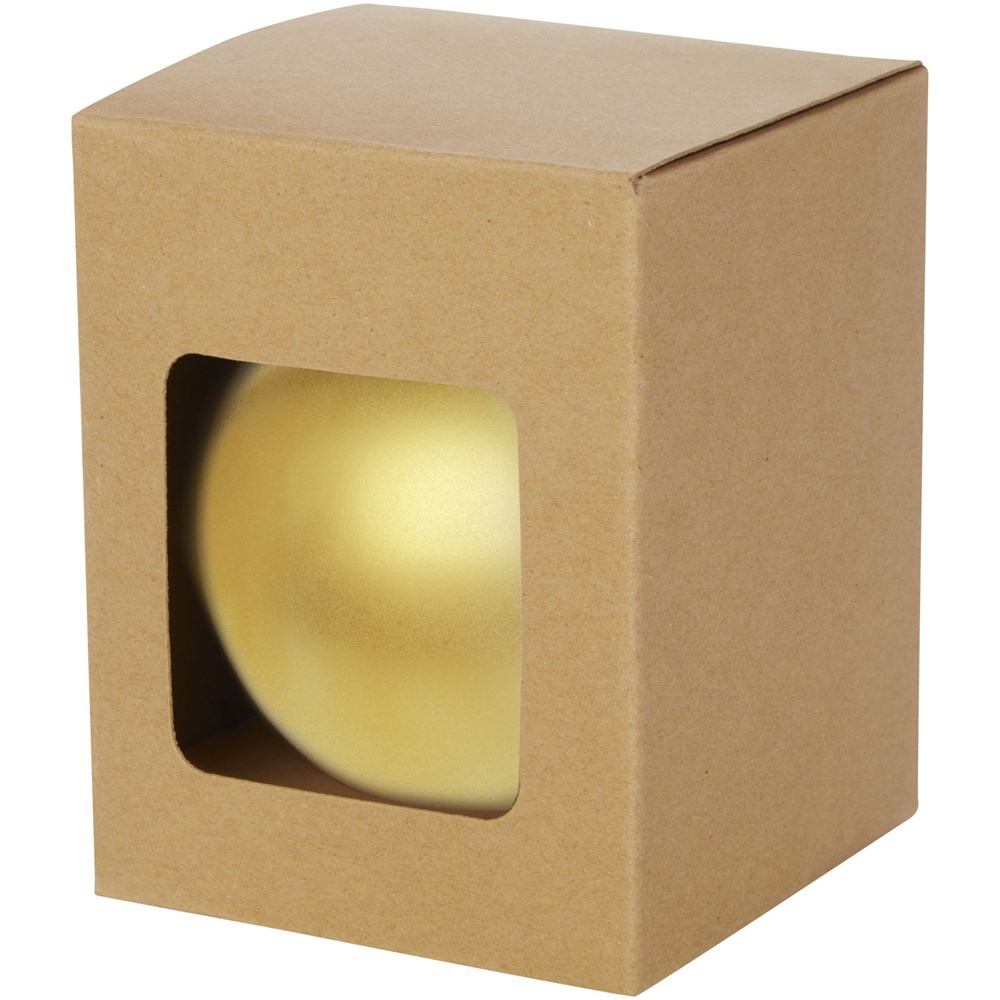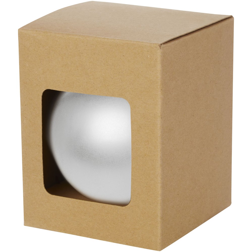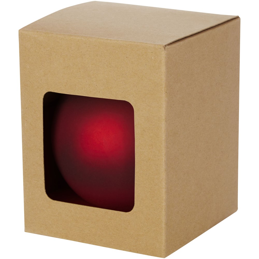Kerstbal met glanzende afwerking, een ronde hanger en een koord van 5,5 cm. Individuele geschenkverpakking van kraftpapier met venster aan de voorkant om het decoratiegebied te tonen.