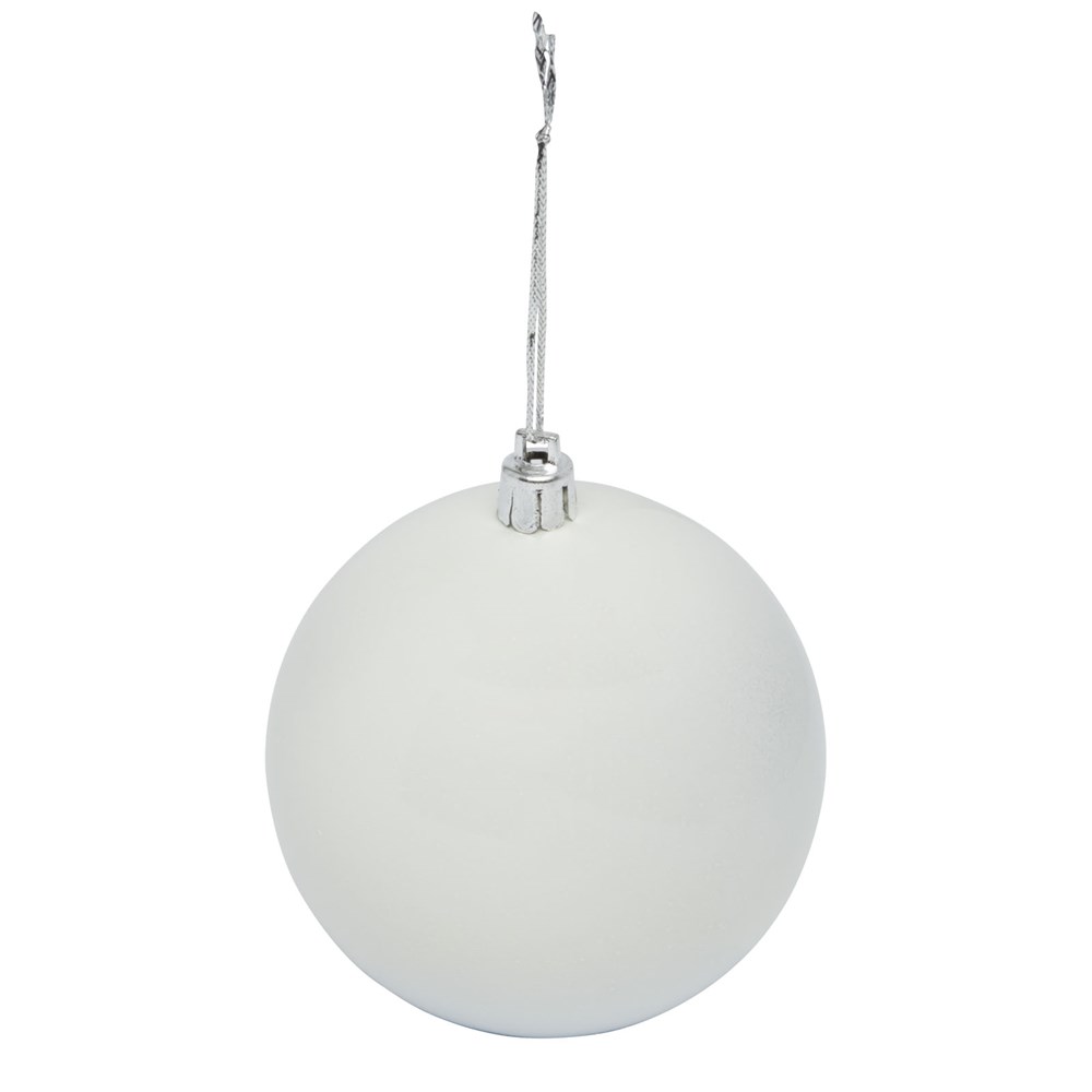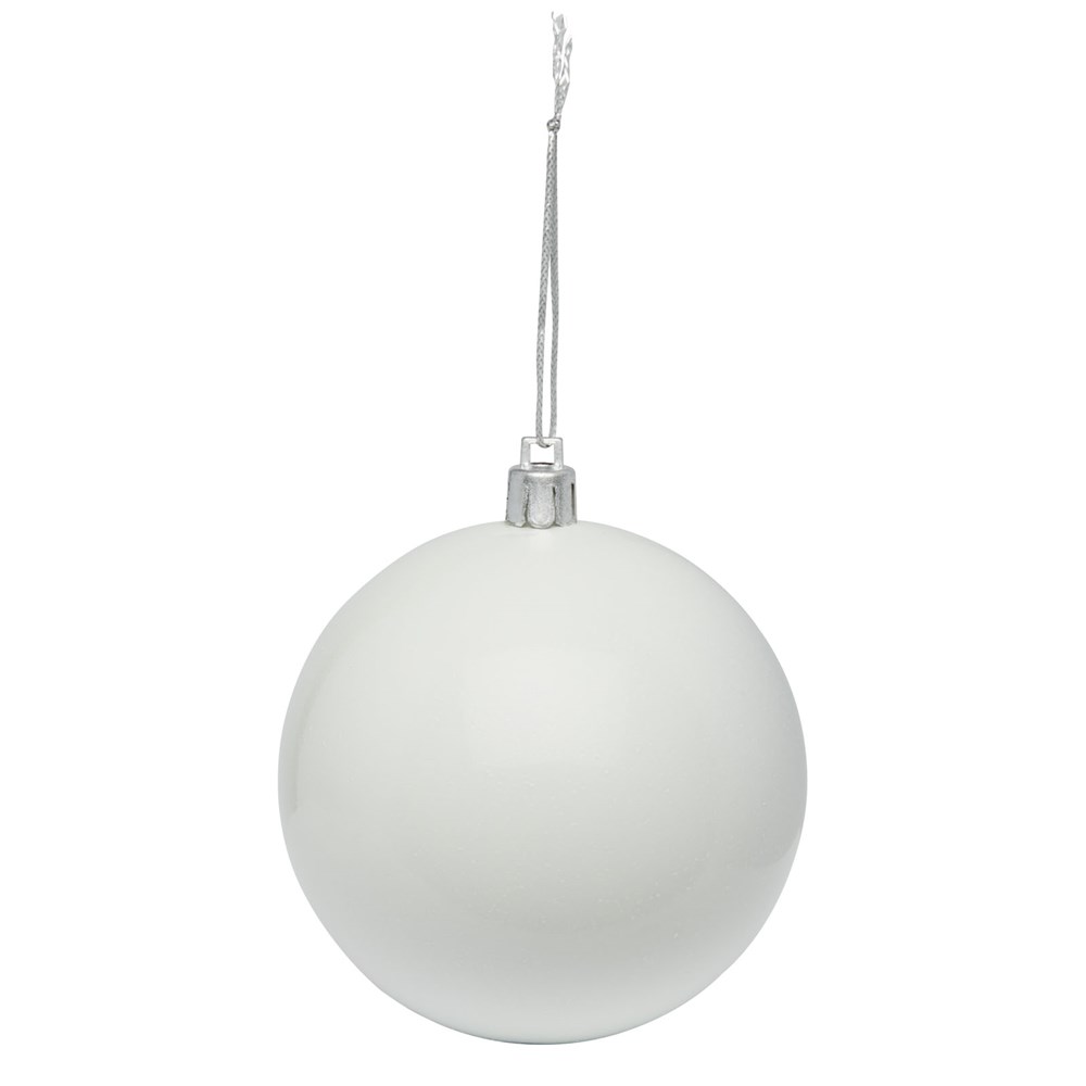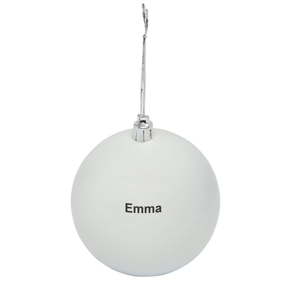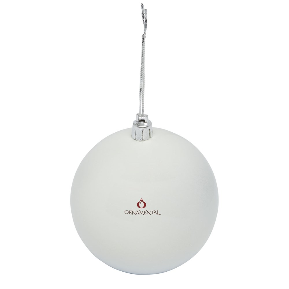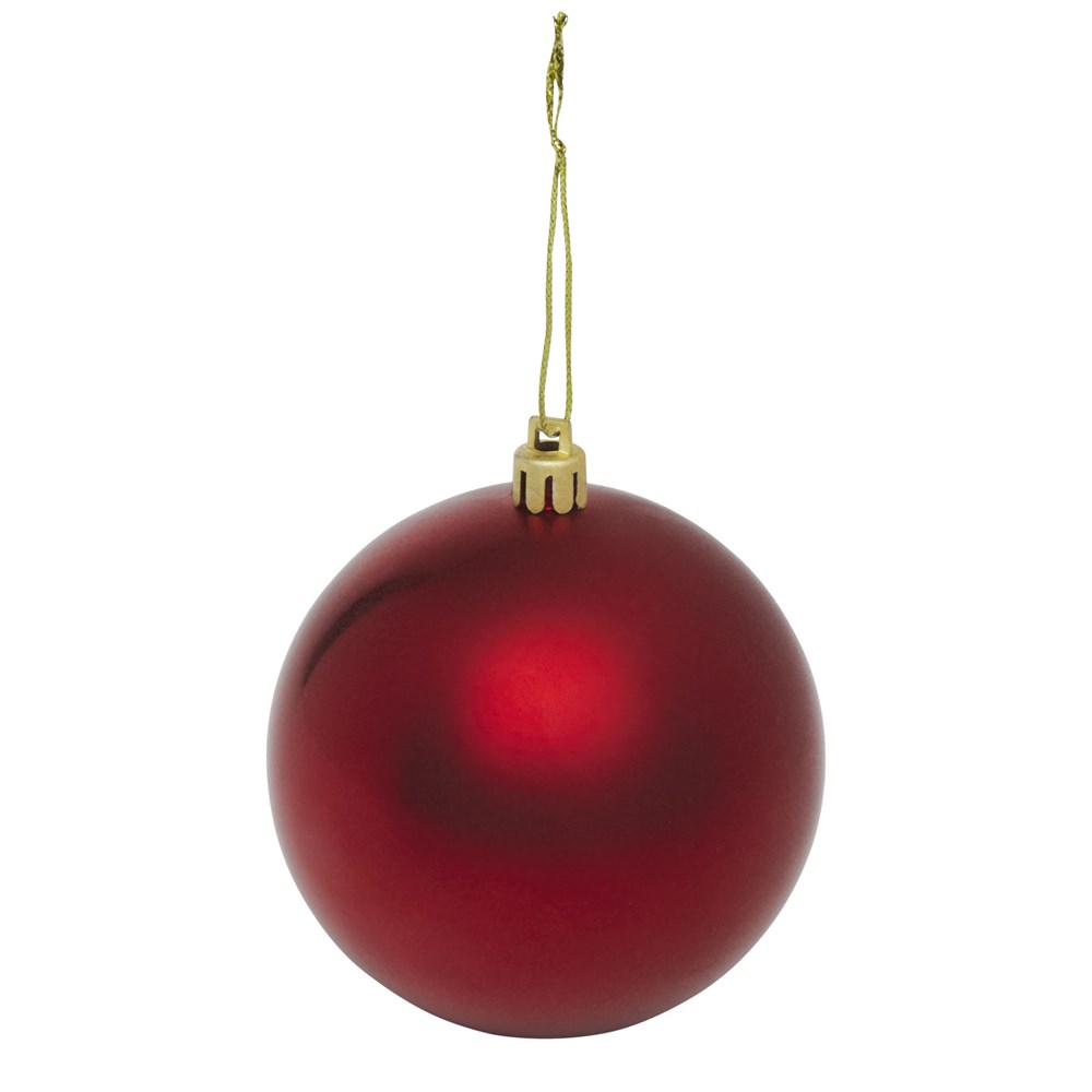 Kerstbal met glanzende afwerking, een ronde hanger en een koord van 5,5 cm. Individuele geschenkverpakking van kraftpapier met venster aan de voorkant om het decoratiegebied te tonen.