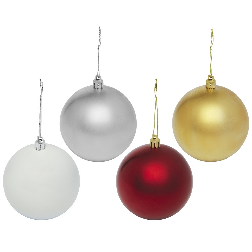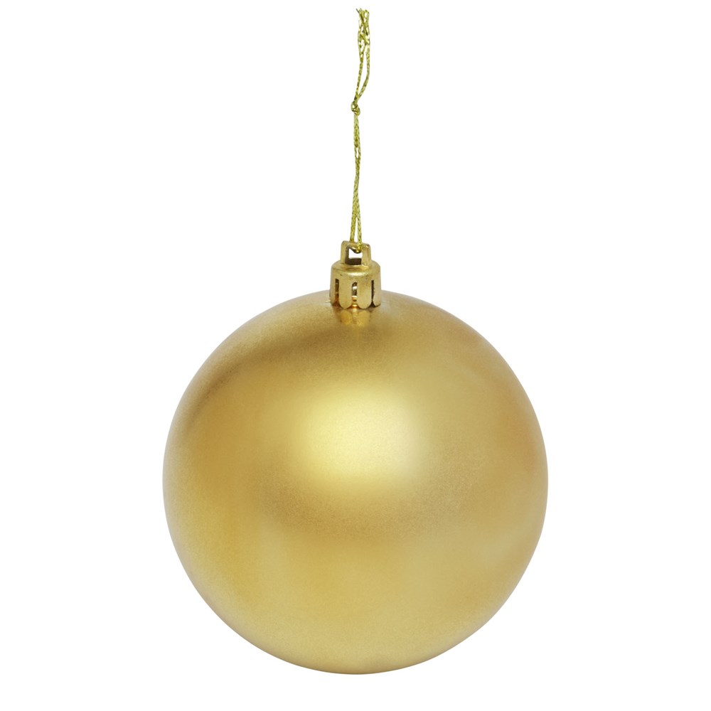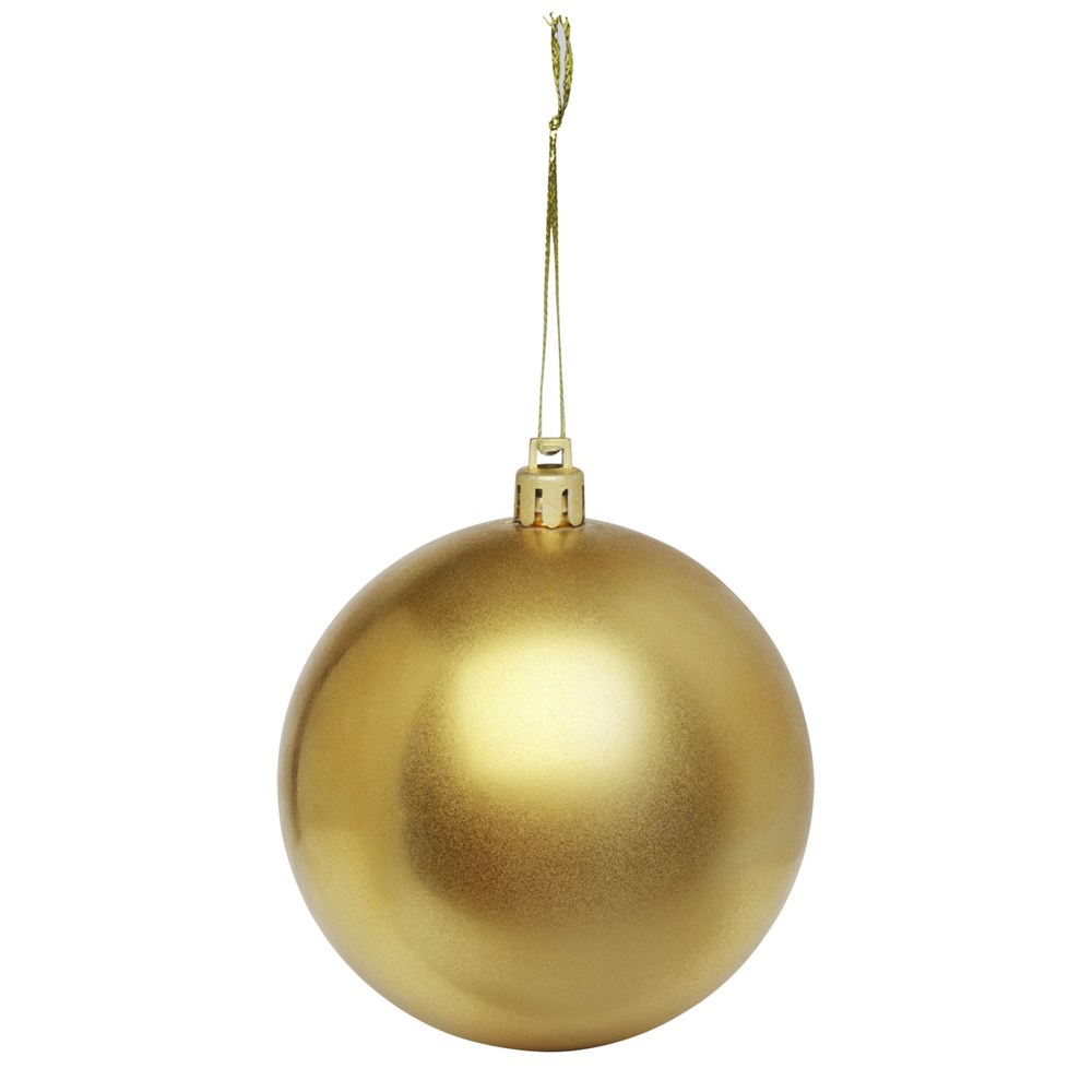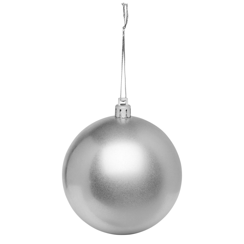 Kerstbal met glanzende afwerking, een ronde hanger en een koord van 5,5 cm. Individuele geschenkverpakking van kraftpapier met venster aan de voorkant om het decoratiegebied te tonen.