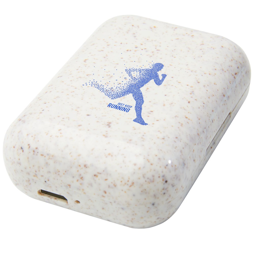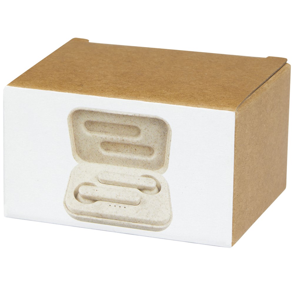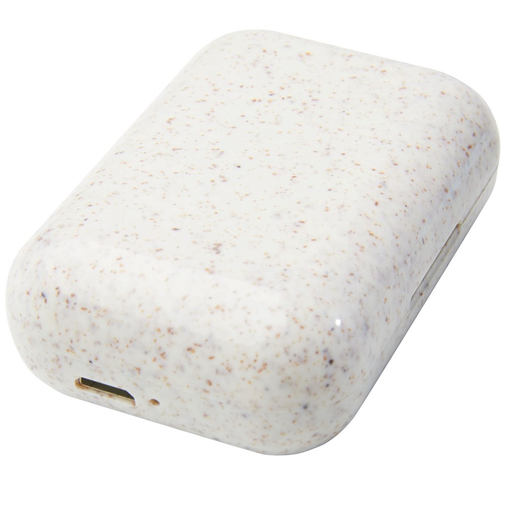 True Wireless stereo-oordopjes gemaakt met een mix van plastic en tarwestro, waardoor er minder plastic nodig is. Met geïntegreerde multifunctionele knop om alle functies te bedienen: Aan/uit, beantwoorden/ophangen, afspelen, pauzeren, volgende/vorige nummer, volume omhoog/omlaag, stemassistent activeren. Bluetooth® 5.0 met afstand tot 10 meter. De powercapsule kan de oordopjes minimaal 3 keer opladen van 0 tot 100%. De afspeeltijd is maximaal 2 uur op maximaal volume en de oordopjes kunnen in 1 uur volledig worden opgeladen. Geleverd in een geschenkverpakking inclusief handleiding (beide gemaakt van duurzaam materiaal).
