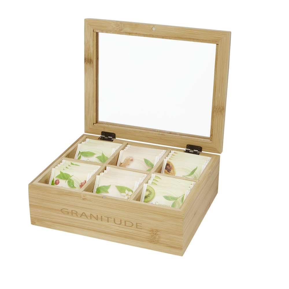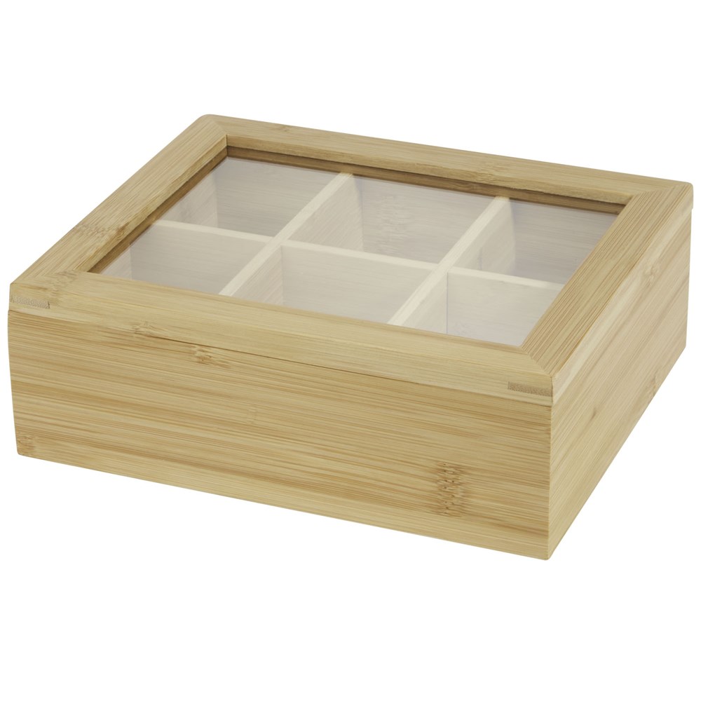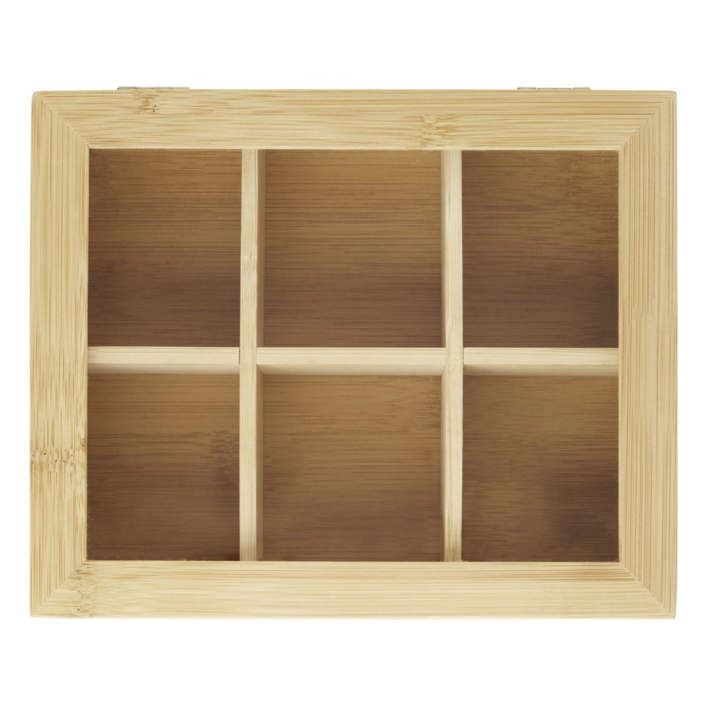 Bamboe theedoos met transparant plastic deksel. Heeft 6 gelijk verdeelde compartimenten voor maximaal 36 theezakjes. Het plastic is aan beide zijden voorzien van een foliebeschermer om krassen te voorkomen en kan voor gebruik eenvoudig worden verwijderd.