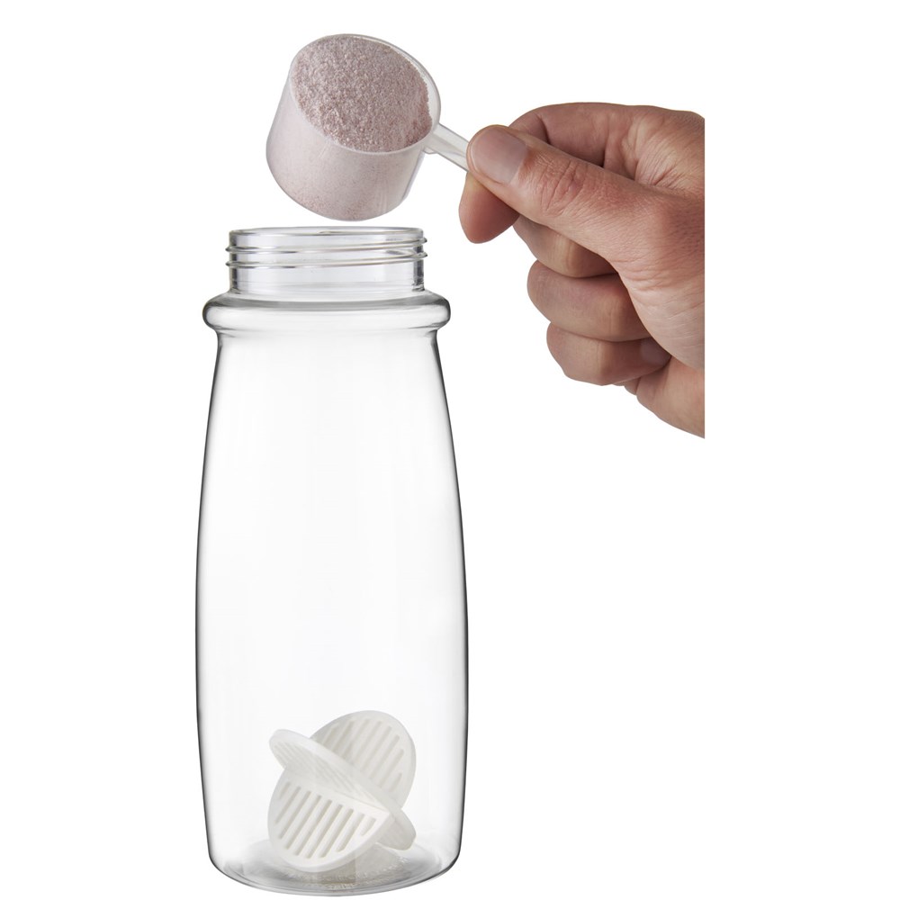 Enkelwandige drinkfles met schudbal voor het glad mengen van eiwitshakes. Voorzien van een morsbestendige dop met flip sluiting en flesontwerp met rondingen. Volumecapaciteit is 600 ml. Gemaakt in het Verenigd Koninkrijk. Verpakt in een thuis composteerbare zak.