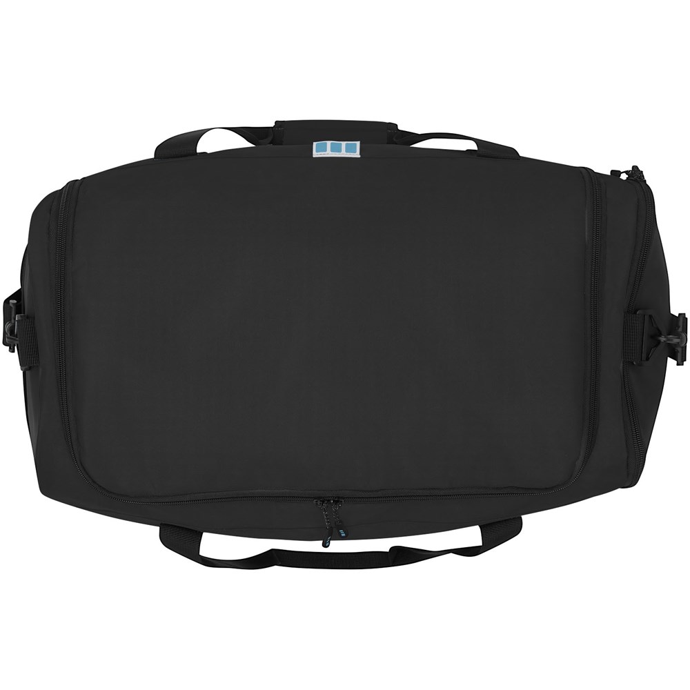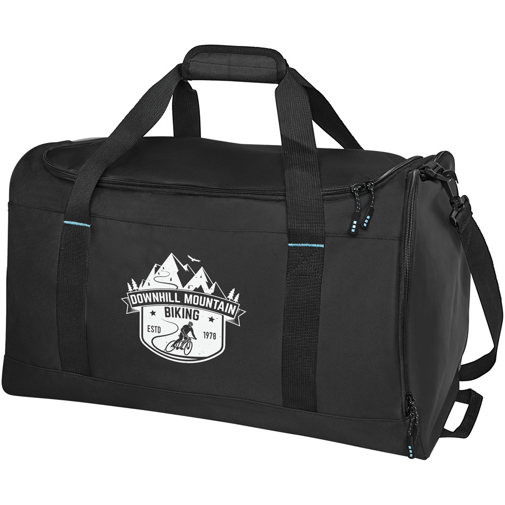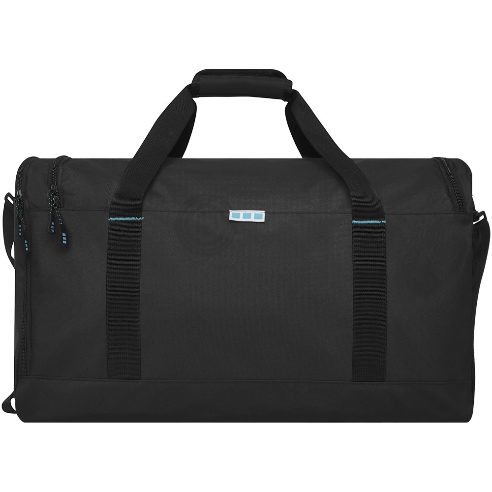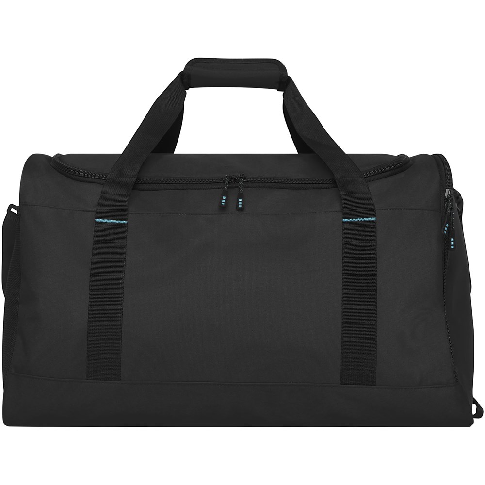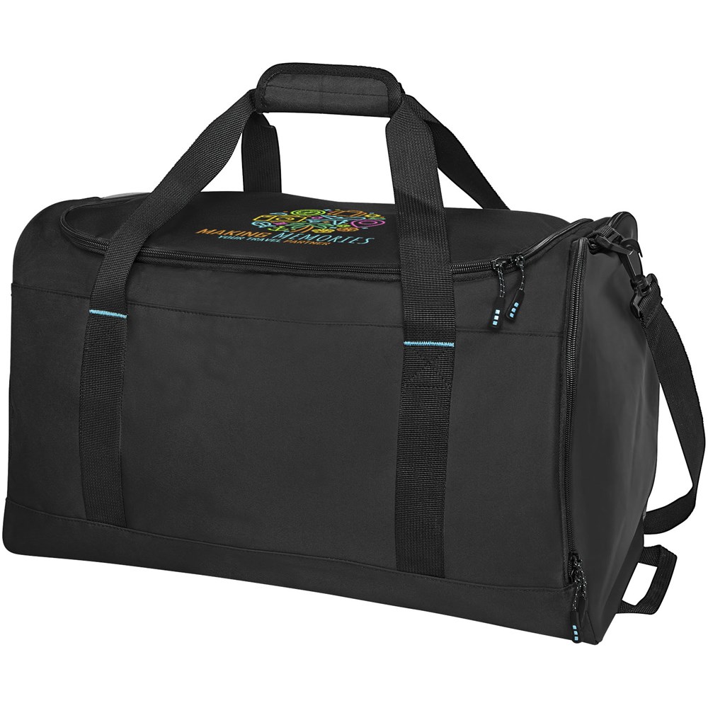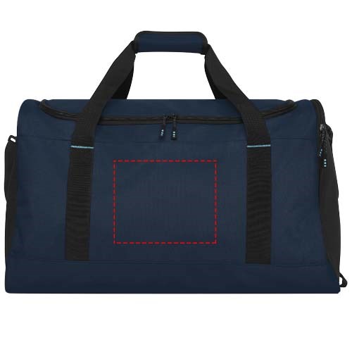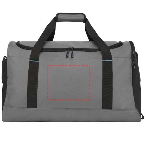 Duurzame GRS-gecertificeerde RPET duffeltas gemaakt met 55% gerecyclede materialen. Voorzien van een groot hoofdvak met rits, een versterkt basispaneel, een mesh zijvak en een uitbreidbaar vak met rits voor de scheiding van natte en droge kleding. Wordt geleverd met een klein binnenvak met rits voor organisatie, verwijderbare en gewatteerde schouderband, hengsels met gewatteerde klittenbandsluiting, en een extra hengsel aan de rechter onderkant.