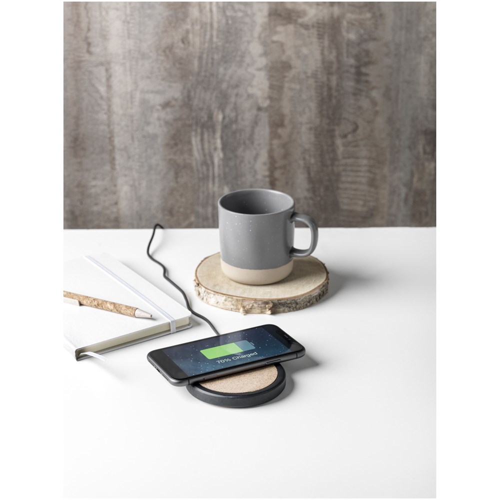 10W draadloos oplaadstation gemaakt van een combinatie van natuurlijke kalksteen en kurk. Om een apparaat met draadloze technologie op te laden, heb je een externe ontvanger voor draadloos opladen of hoesje met ingebouwde draadloze ontvanger nodig. Verpakt in een geschenkverpakking en geleverd met een gebruiksaanwijzing (beide gemaakt van duurzaam materiaal)