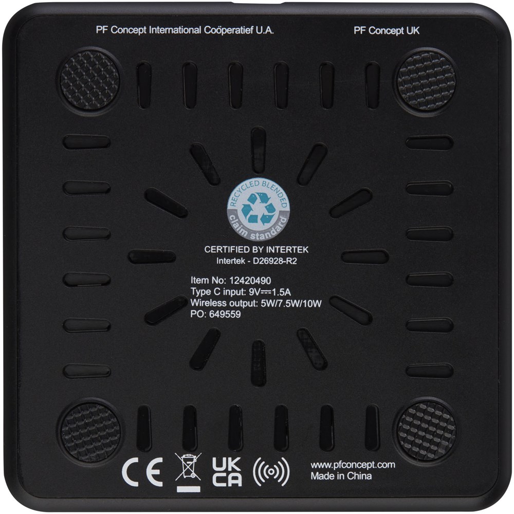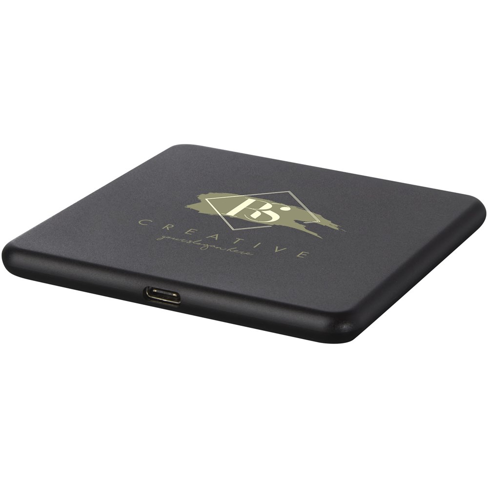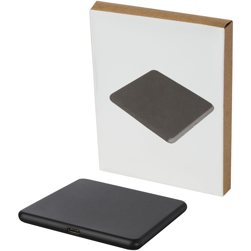 Draadloos oplaadstation gemaakt van RCS-gecertificeerd gerecycled ABS plastic. RCS (Recycled Claim Standard) is een norm om het gerecyclede gehalte van een product in de gehele leveringsketen te verifiëren. Sluit de oplaadpad aan op een computer of laptop en plaats het apparaat erop om het opladen te starten. Draadloze output is 10 W (max) voor snel opladen. Compatibel met alle Qi-apparaten (iPhone 8 of hoger en Android-apparaten die draadloos opladen ondersteunen). Geleverd in een geschenkverpakking inclusief handleiding (beide gemaakt van duurzaam materiaal).