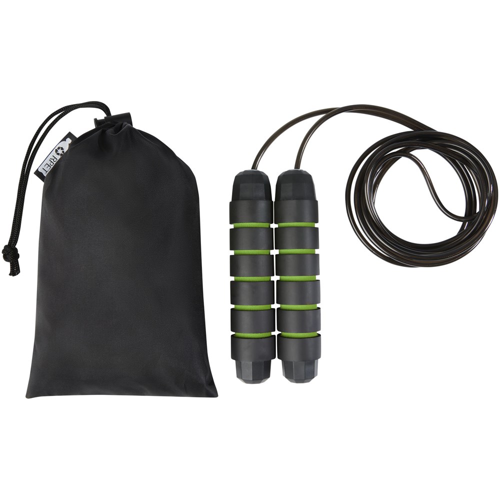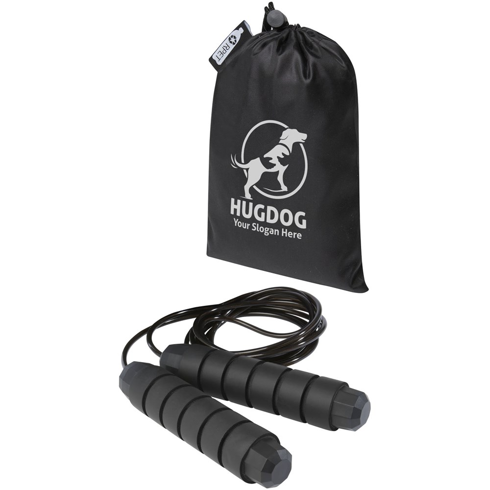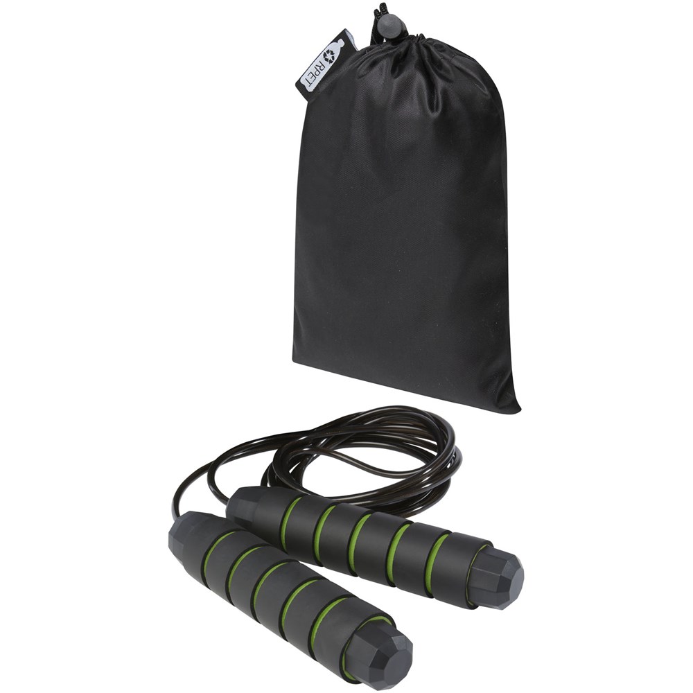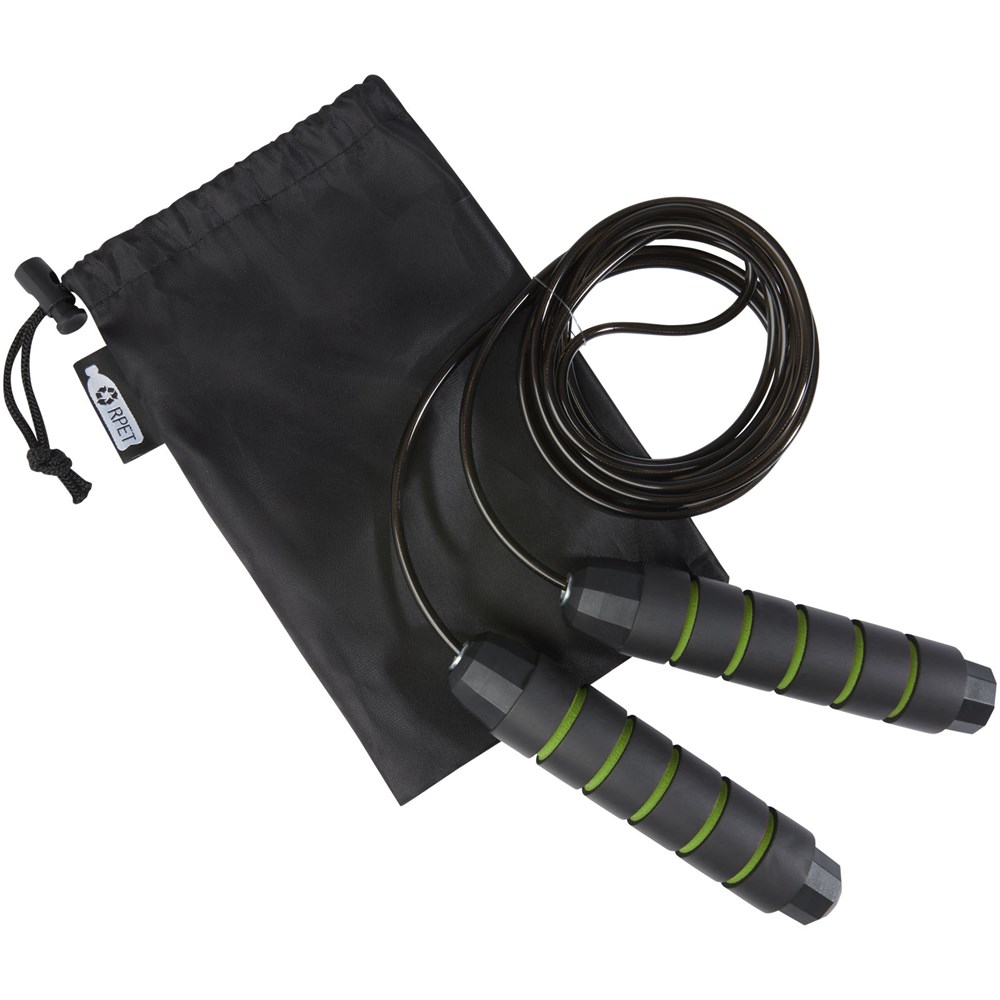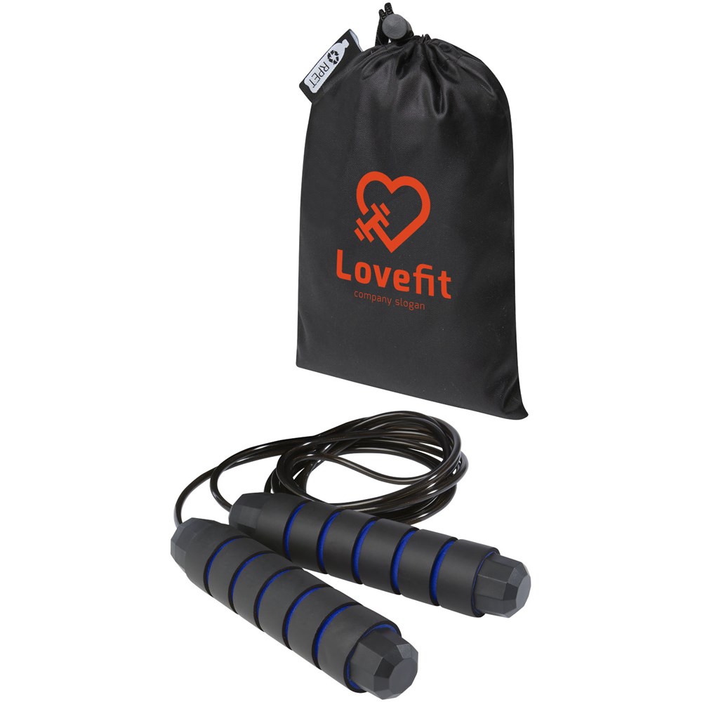 Professioneel springtouw voor volwassenen met ergonomisch gevormde handgrepen van zacht foam, voor een stevige en comfortabele grip tijdens de training. De lengte van het touw is 310 cm, waardoor volwassenen tot 195 cm gemakkelijk kunnen springen. De lengte van het touw is verstelbaar en heeft een ingebouwd hoogwaardig, 360° draaibaar, snel kogellager om een soepele, moeiteloze rotatie te garanderen en verstrikking te voorkomen. Geleverd met een opbergzakje (21 x 14 cm) gemaakt van gerecycled PET plastic, dat een groot oppervlak biedt voor het afdrukken van een logo.
