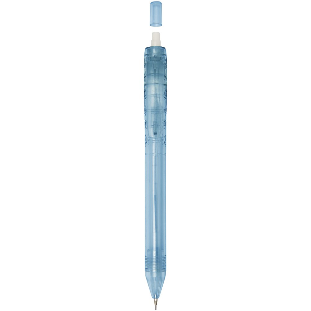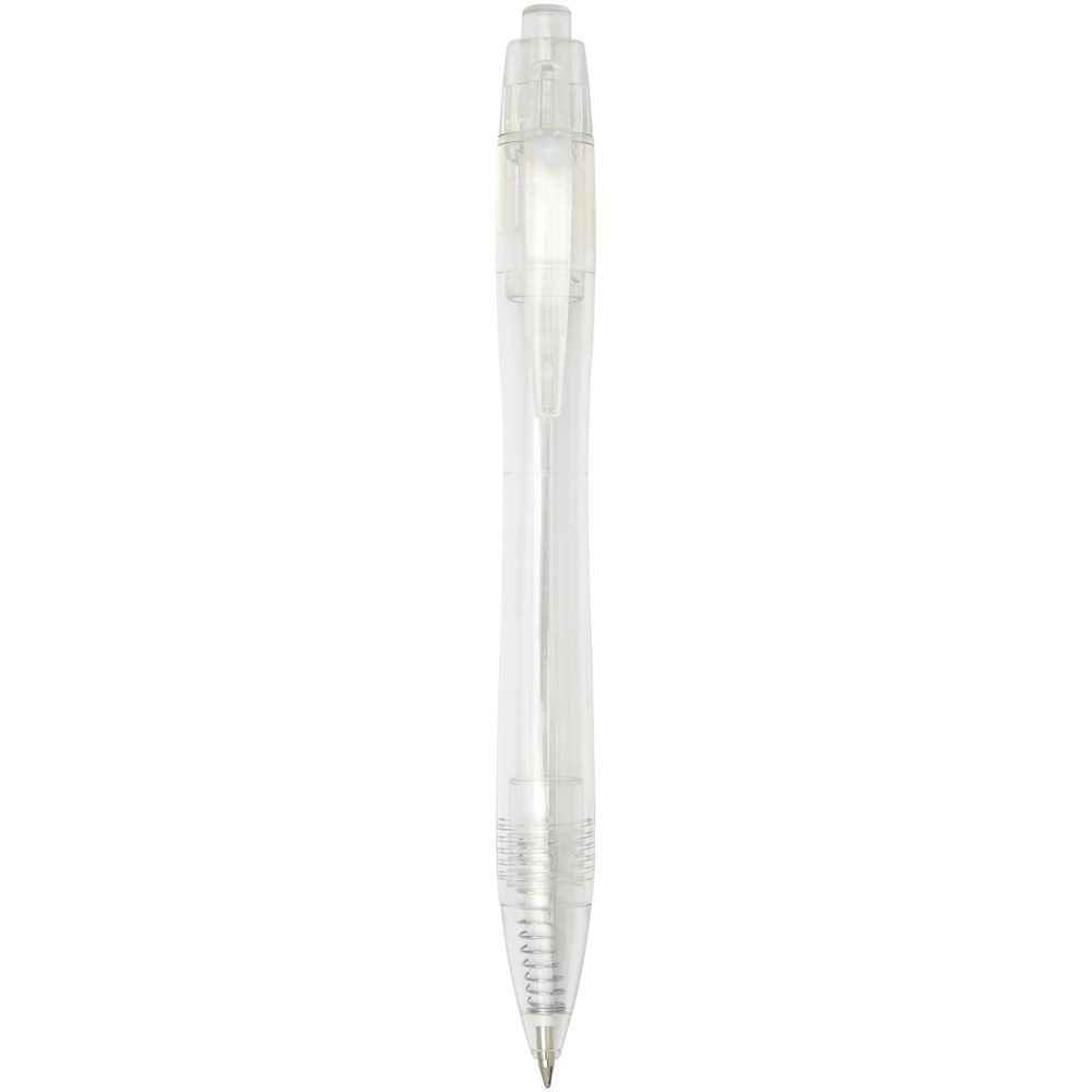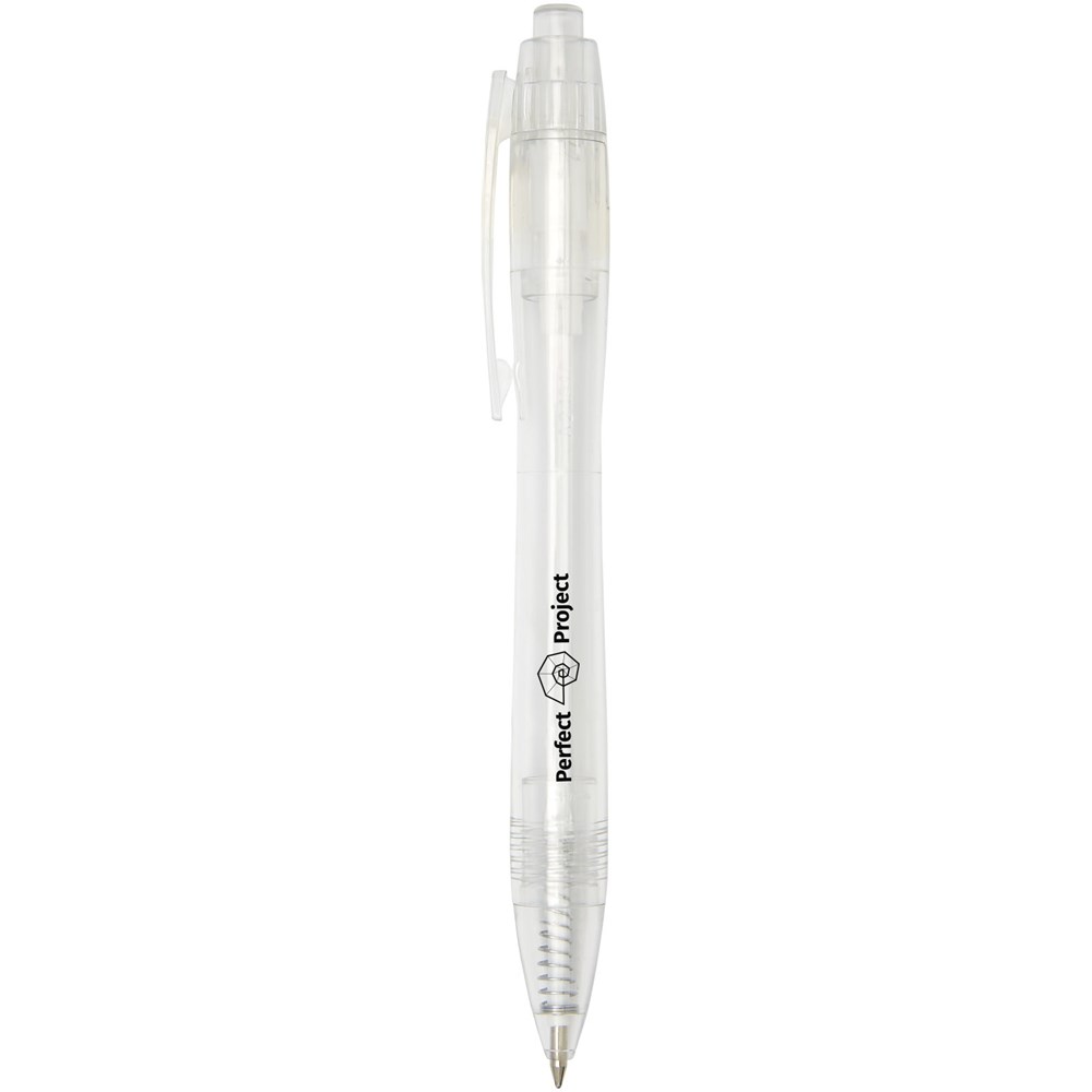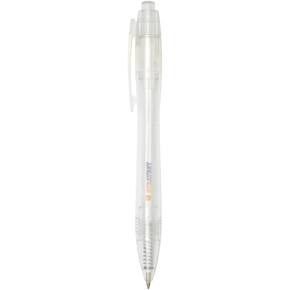Balpen met klikmechanisme en transparante houder. De houder is gemaakt van gerecyclede waterflessen, wat bijdraagt aan het verminderen van de hoeveelheid plastic afval.