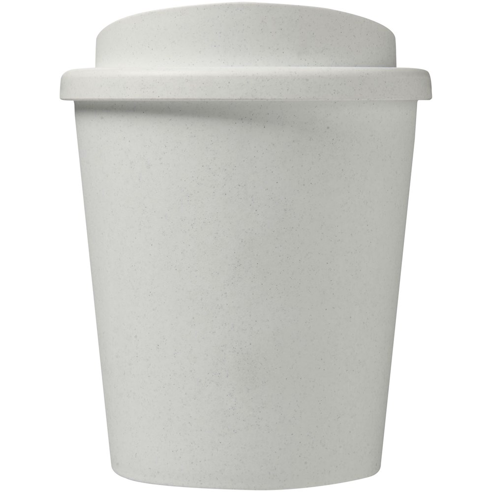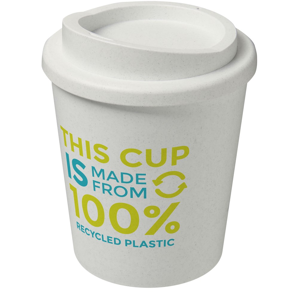 Compacte, dubbelwandige geïsoleerde beker met draaideksel. Past onder de meeste koffiezetapparaten. Inhoud 250 ml Gemaakt van 100% gerecycled materiaal. De kleuren zwart of wit kunnen variëren en de witte optie heeft een textuur kleureffect, vanwege de aard van het gerecyclede materiaal. Gemaakt in het Verenigd Koninkrijk. Verpakt in een thuis composteerbare polybag.